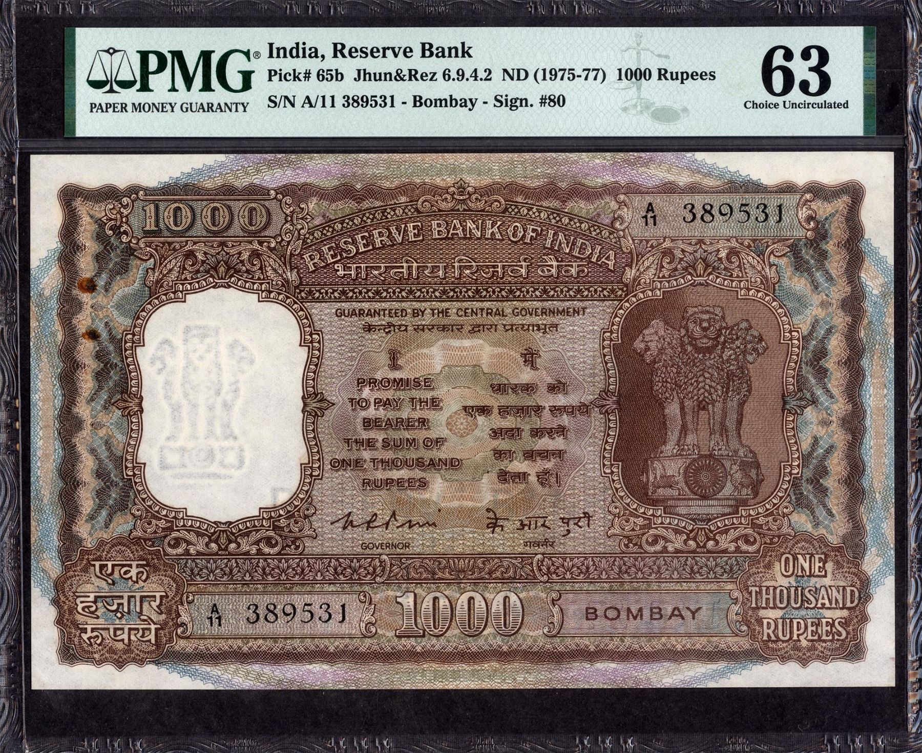 Republic India,1975,1000 Rupees, BombayCircle, Signed byK.R. Puri,A Prefix,S. No. A11 389531,a picture of Brihadeeswara temple at Tanjore on the reverse,(KJ RR # 6.9.4.2/RM AM # R10.11), staple holes at issue, rust,graded by PMGas 63 Choice Uncirculated, Extremely Rare in this grade.