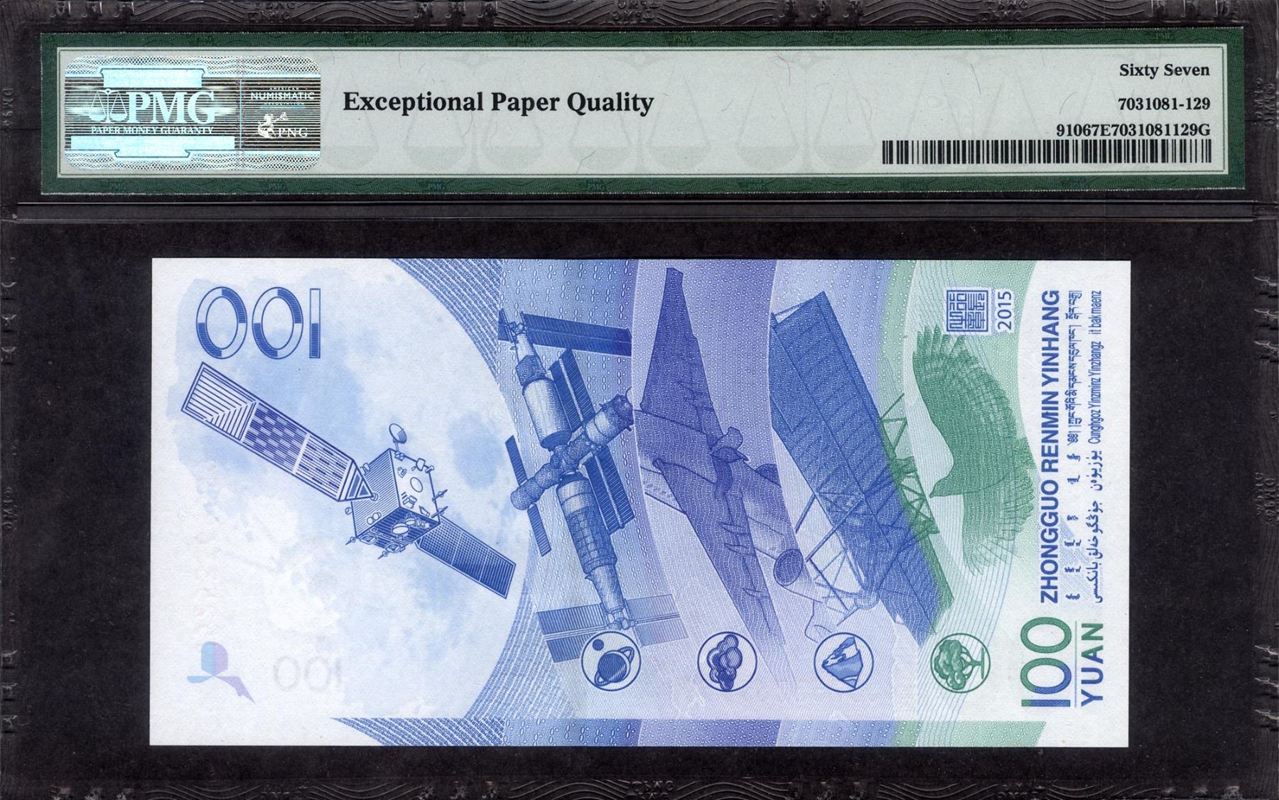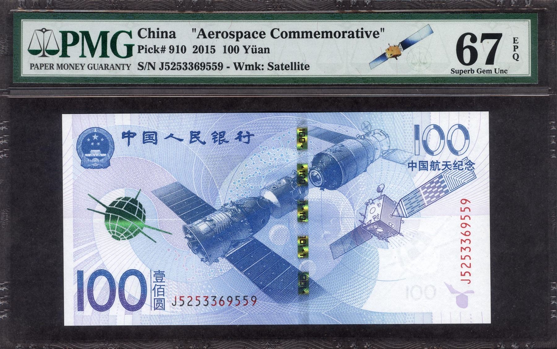 China, 100 Yuan,2015, Peoples Bank of China,Chinese Aerospace Commemorative,S. No. J5253369559, (Pick # 910), exceptional paper quality,graded by PMG as 67 Superb Gem Unc EPQ.
