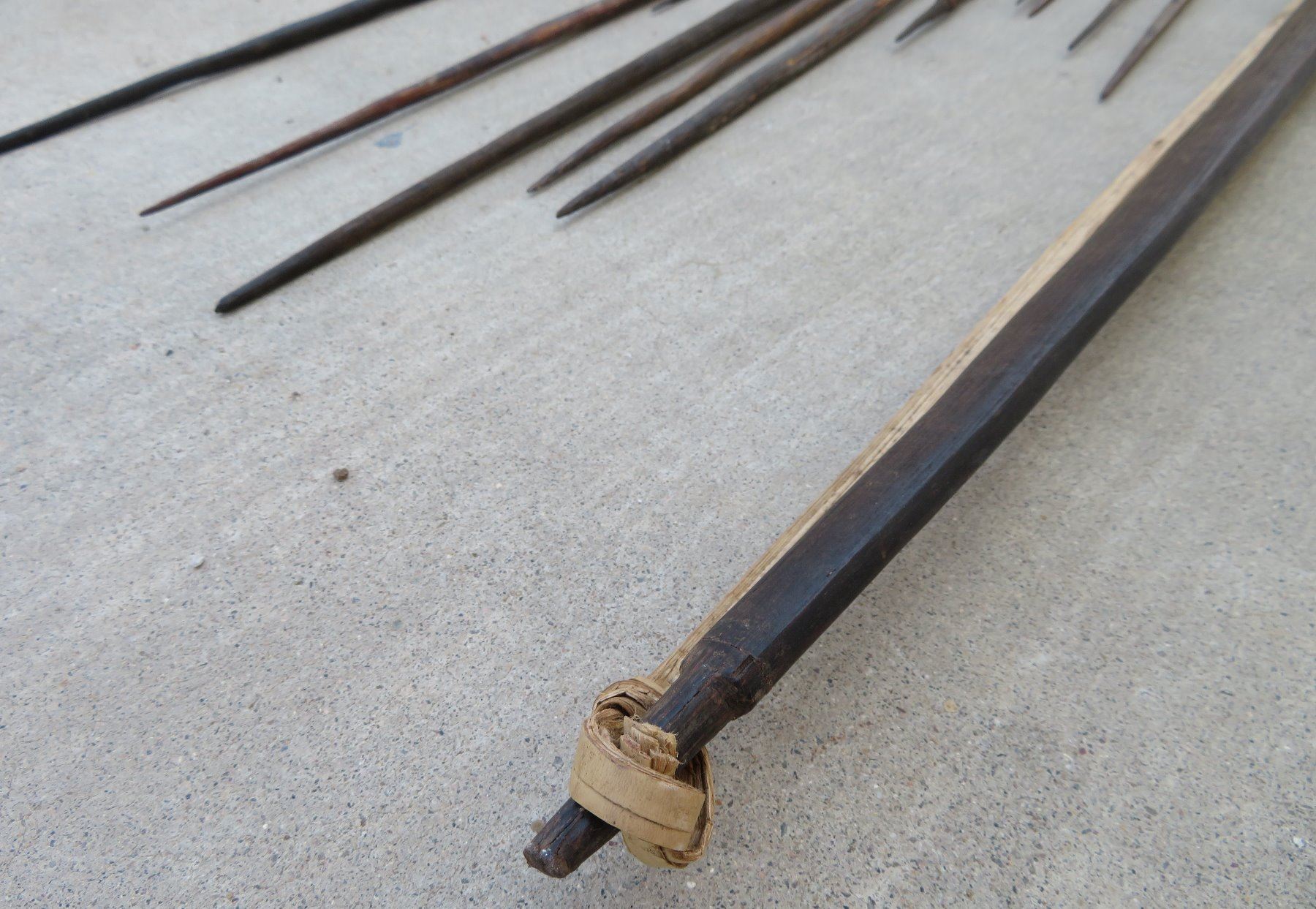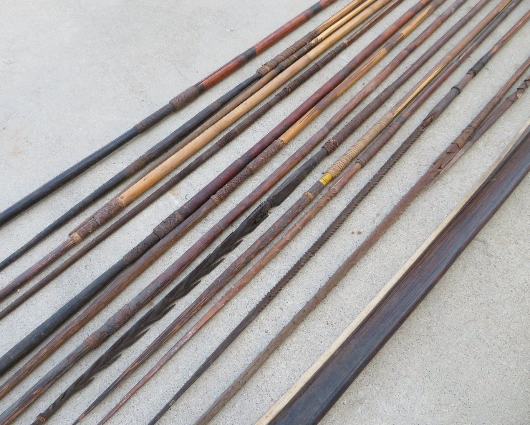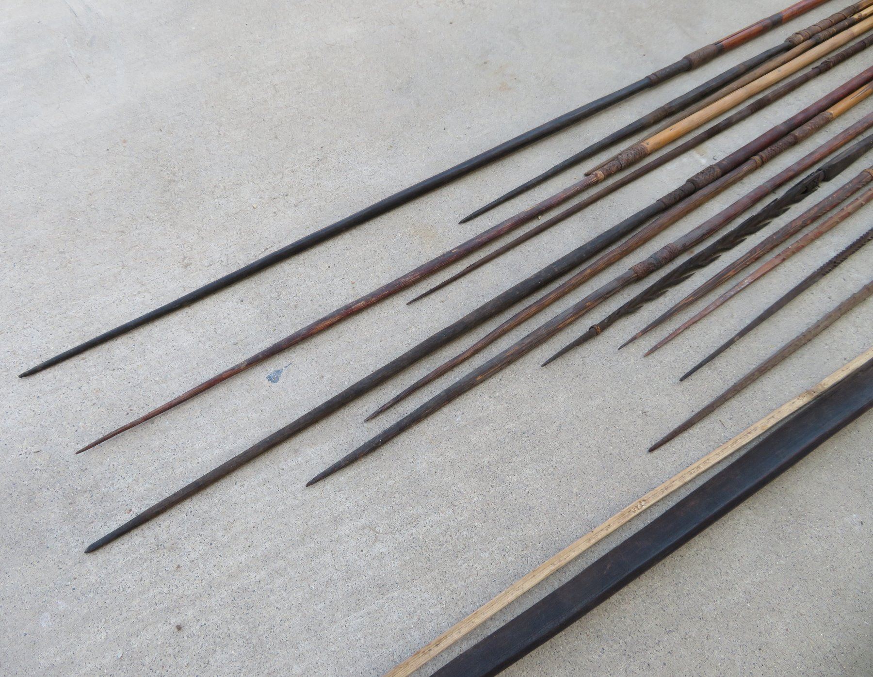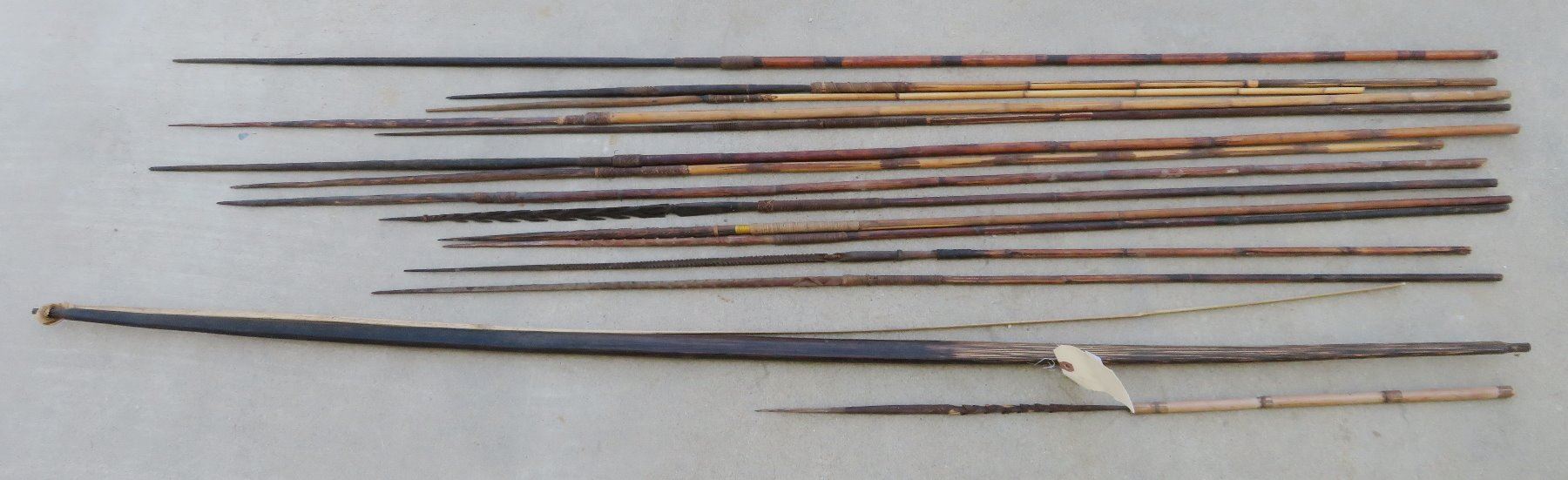 PNG Bow & Arrow Set, c. 1940s. Made of bamboo and wood, the longest item measures 62". Papua New Guinea. Used in tribal warfare, serrated and barbed points, fancy stitchwork. Condition: As found, see images. Shipping: $65.00 USA estimate only, w/insurance and signature, due to length.