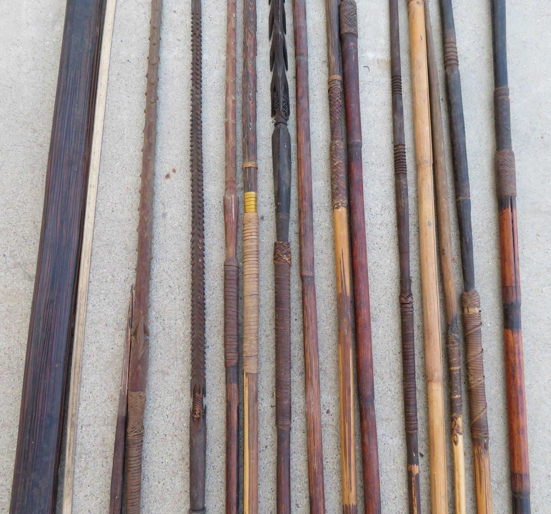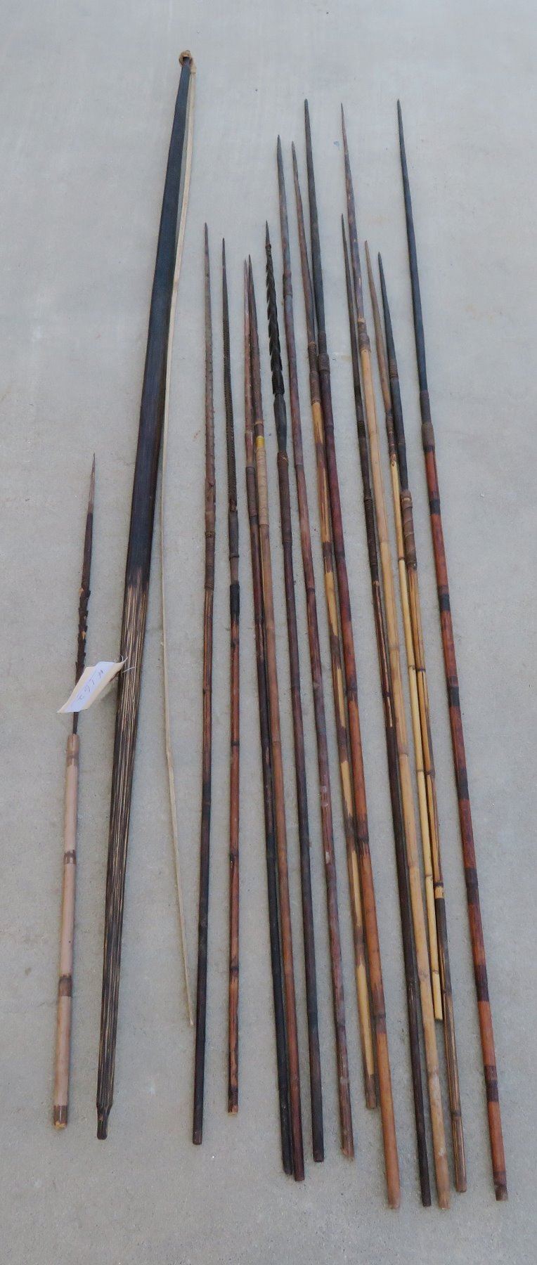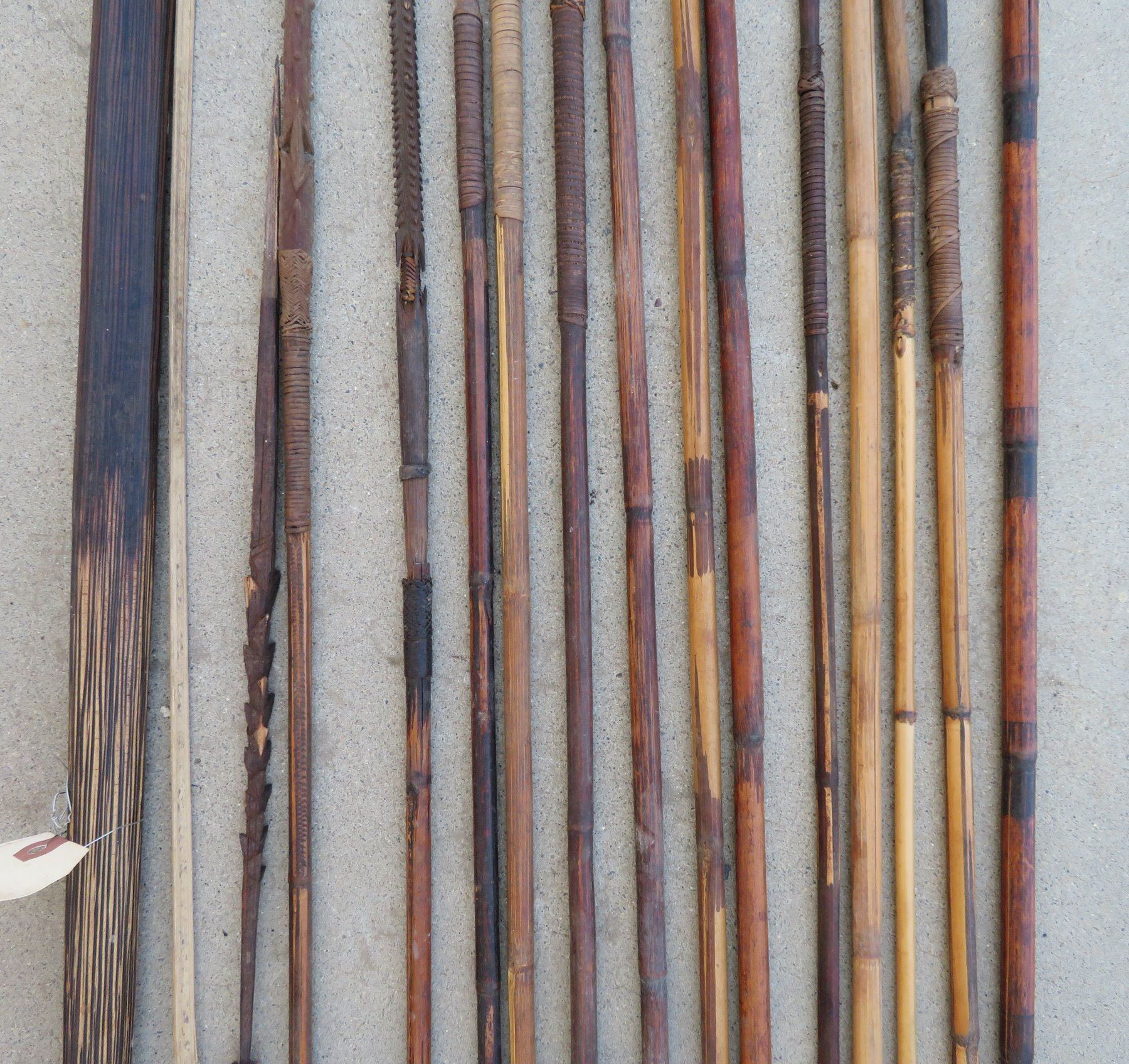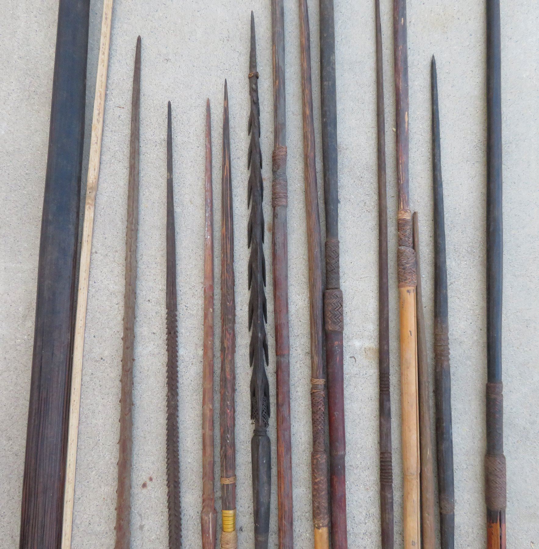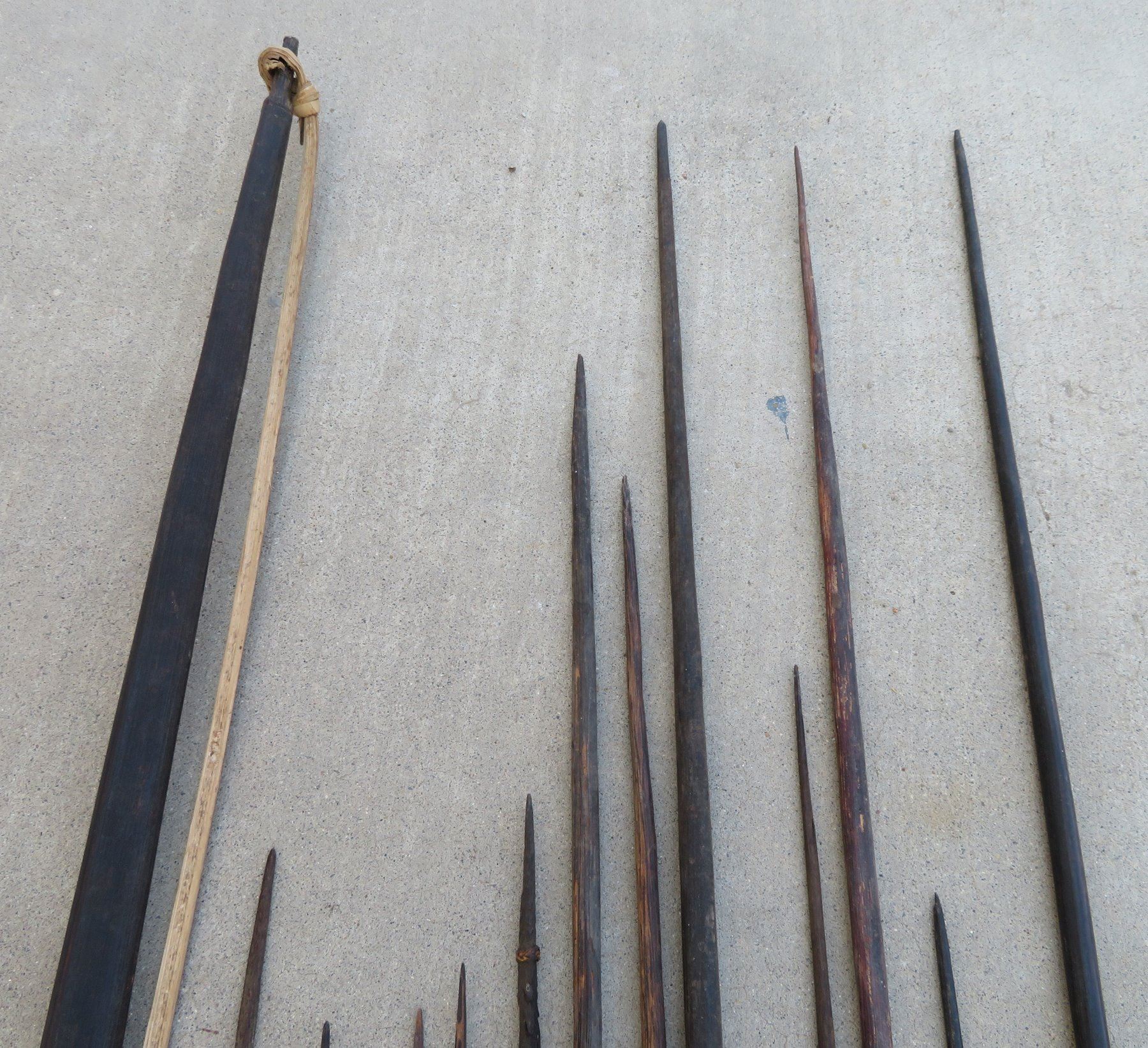 PNG Bow & Arrow Set, c. 1940s. Made of bamboo and wood, the longest item measures 62". Papua New Guinea. Used in tribal warfare, serrated and barbed points, fancy stitchwork. Condition: As found, see images. Shipping: $65.00 USA estimate only, w/insurance and signature, due to length.