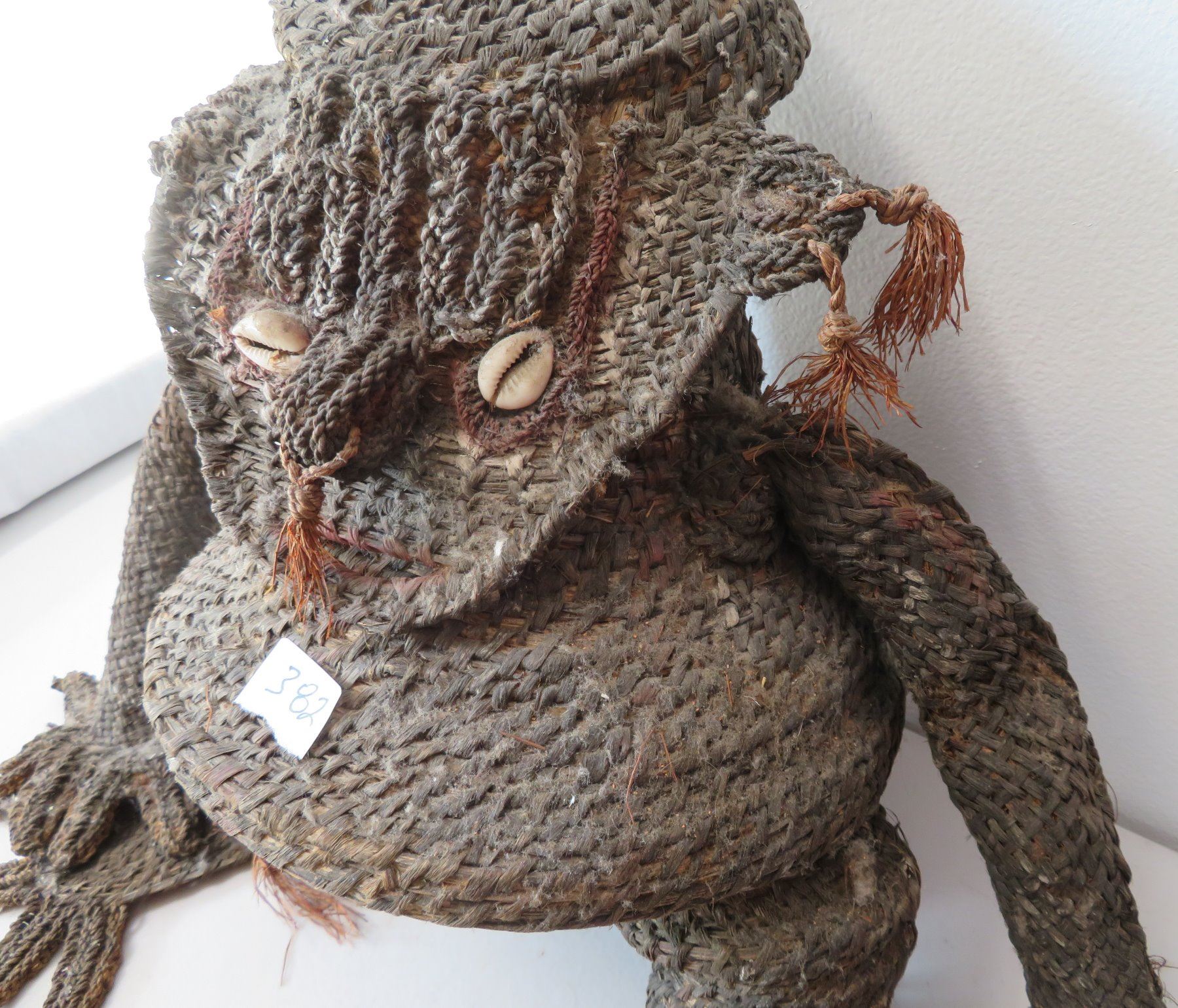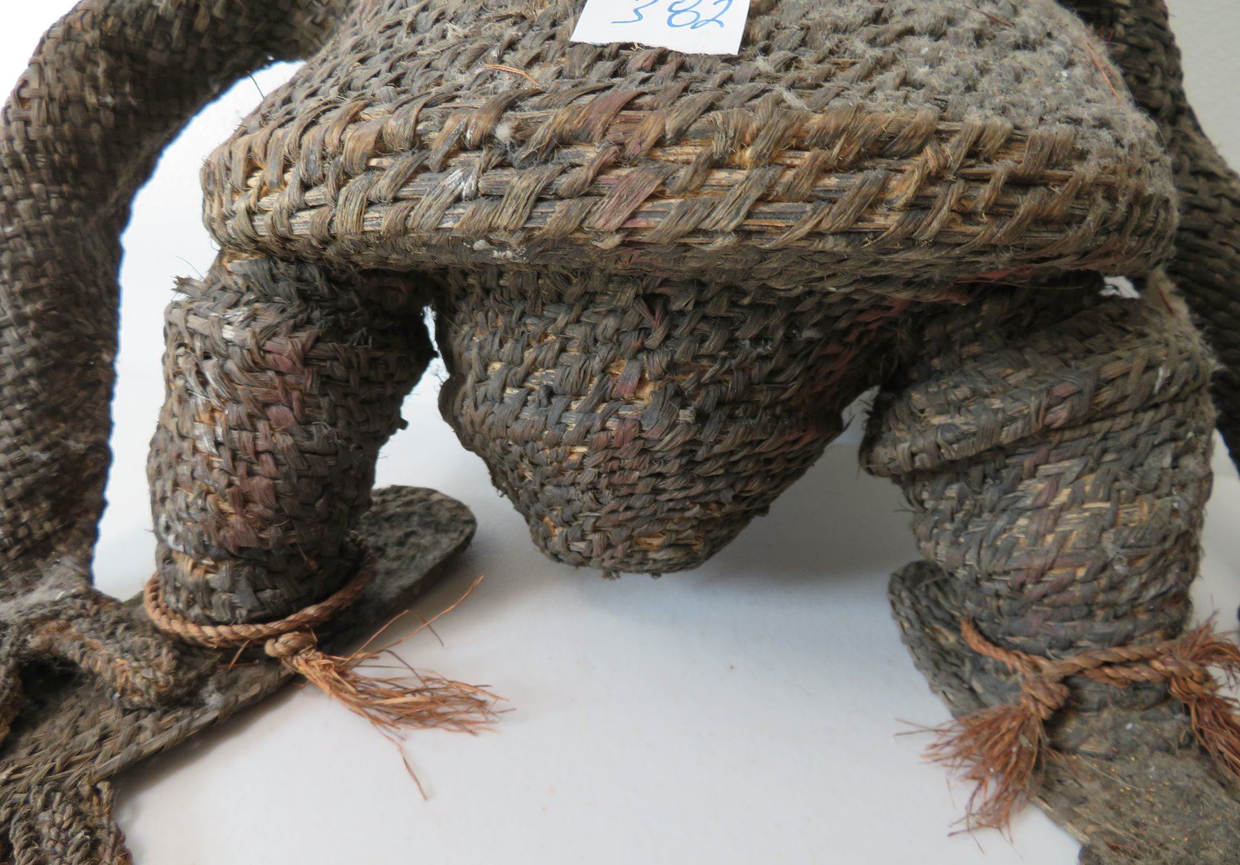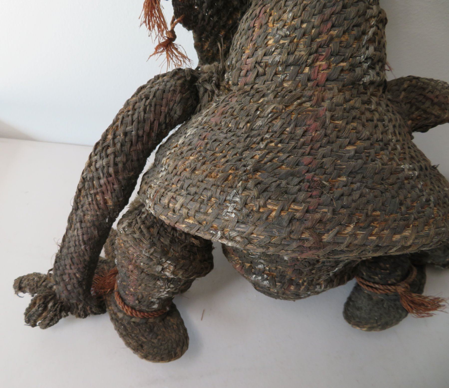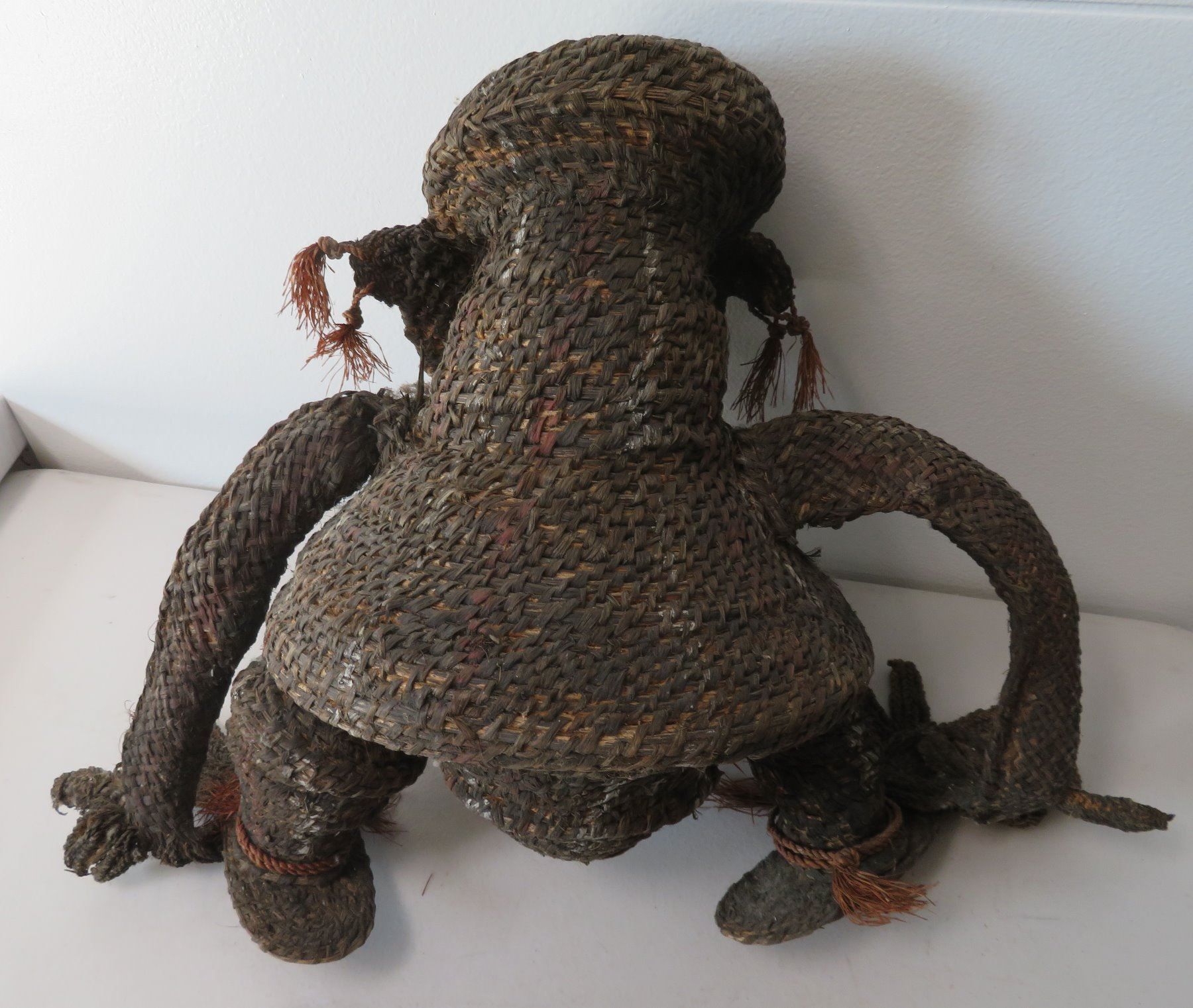 PNG Human Basketry Figure, c. 1920s. Made of fiber and paint, the item measures 16" x 16" x 10". Papua New Guinea. Seldom seen item. Condition: Very flexible, see images. Shipping: $37.50 w/insurance and signature, due to size and value.