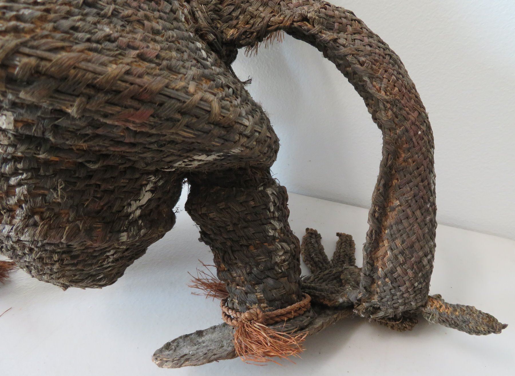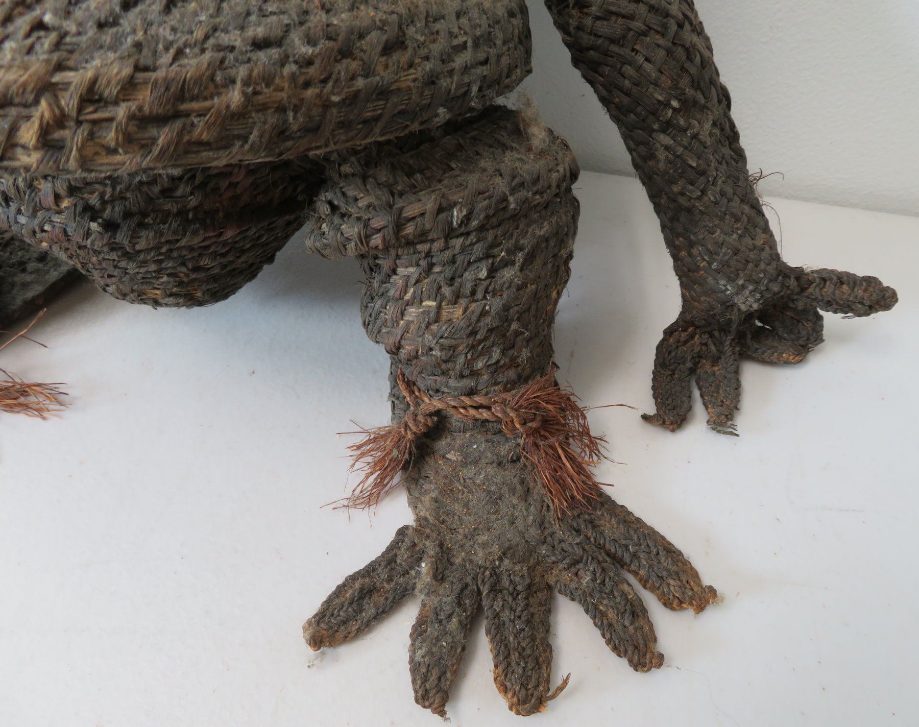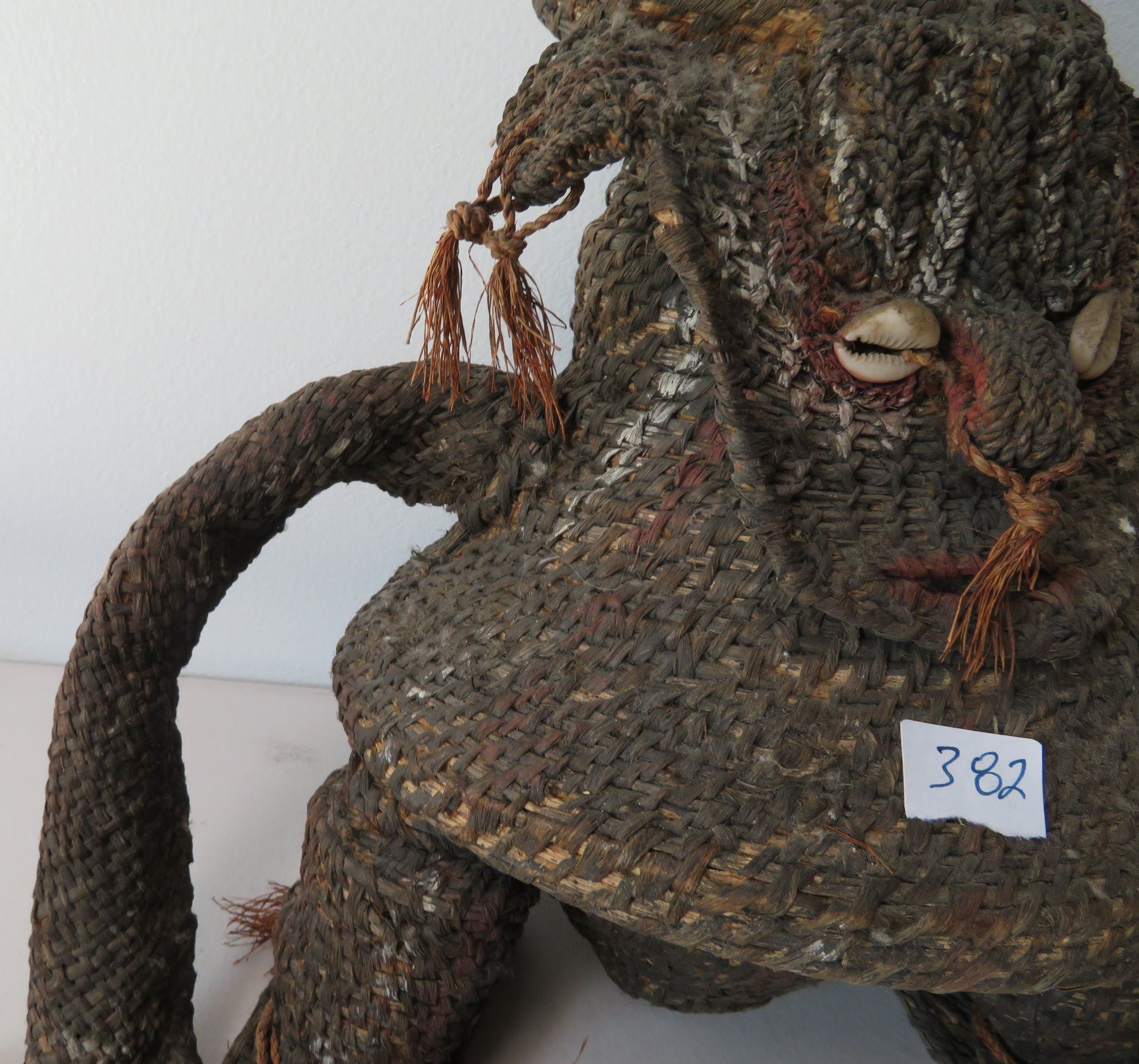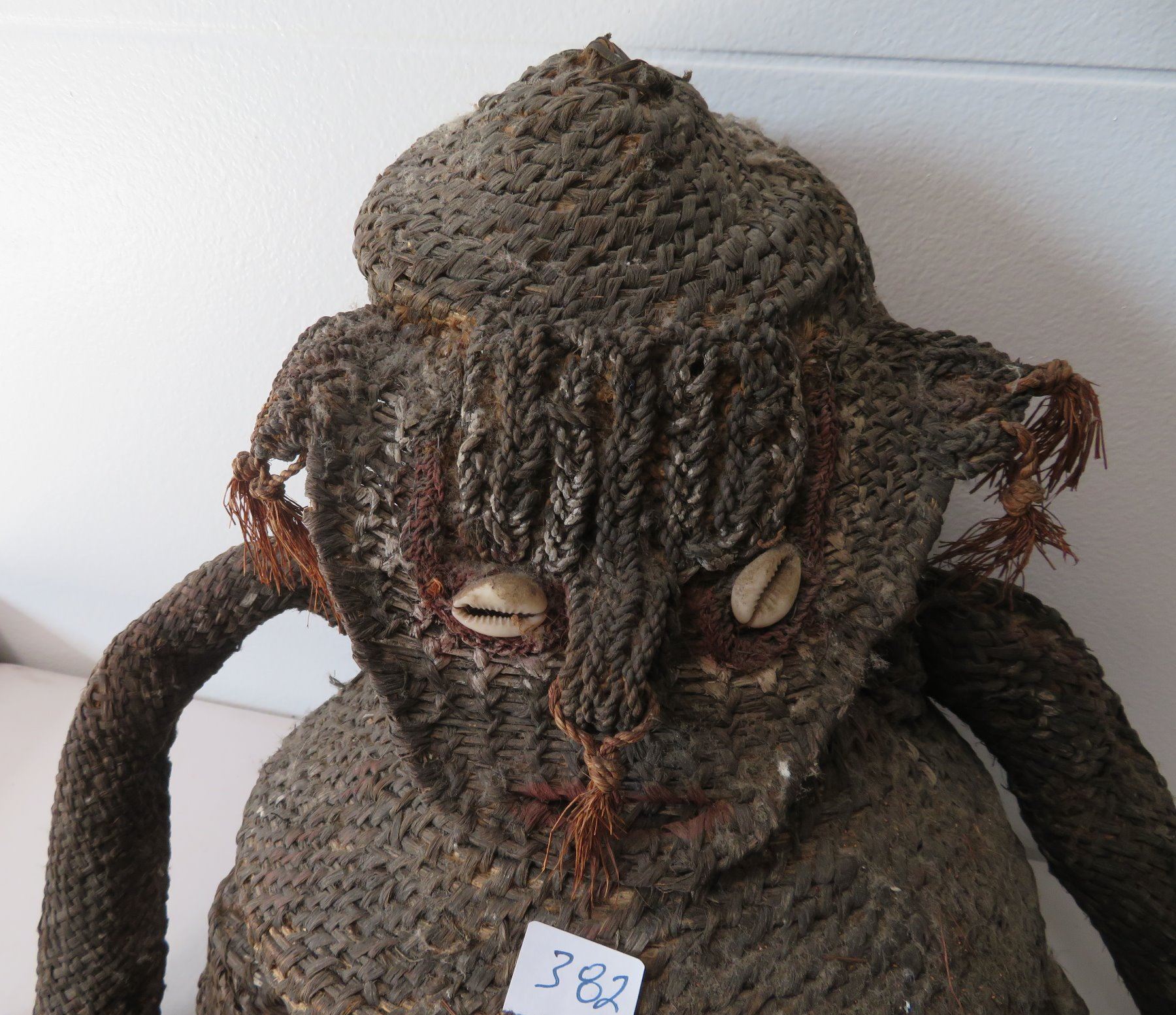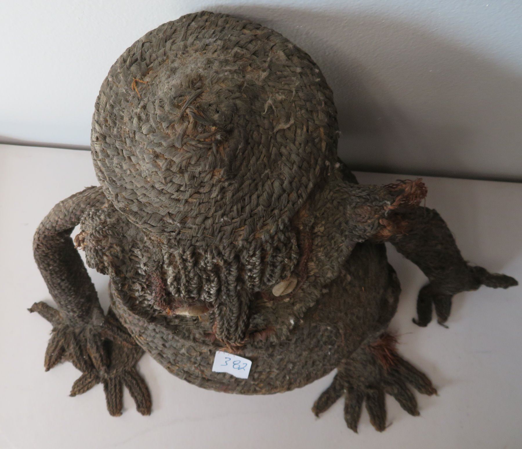 PNG Human Basketry Figure, c. 1920s. Made of fiber and paint, the item measures 16" x 16" x 10". Papua New Guinea. Seldom seen item. Condition: Very flexible, see images. Shipping: $37.50 w/insurance and signature, due to size and value.