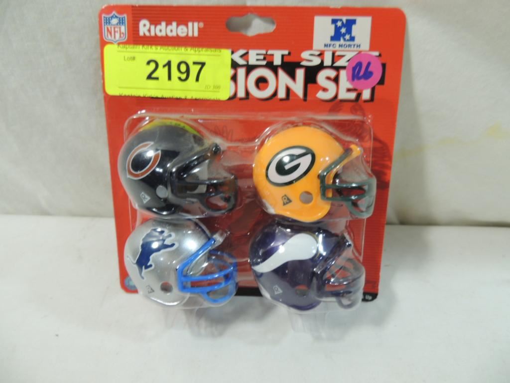 POCKET SIZE DIVISION SET HELMETS, CHICAGO BEARS, GREEN BAY PACKERS, MINNESOTA VIKINGS, DETROIT LIONS RIDELL NFL COLLECTIBLE AS SHOWN SEE PHOTO FOR MORE DETAILS.