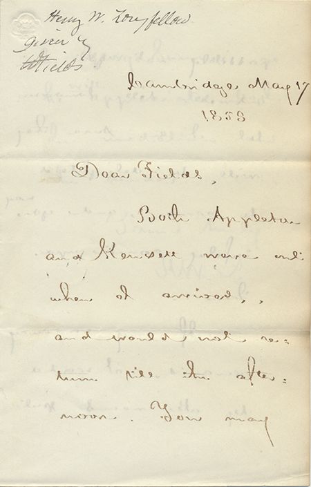 A pair of items by notable nineteenth-century poets, the first HENRY LONGFELLOW (1807 - 1882) American poet and author whose works include The Song of Hiawatha, The Psalm of Life and Paul Revere's Ride; A.L.S. signed with initials 3pp. 8vo., Cambridge, May 17, 1855, to "Fields", in part: "...Both Appleton and Kensett were out when I arrived...I am sure they will be delighted...If any vacancy remains I would by all means put in George Sumner...". Mounting strip to verso, otherwise very good. Along with JOHN. G. WHITTIER (1807-1892), the "Quaker Poet", known for "Barefoot Boy" and "Barbara Freitchie"; A.L.S. 3pp. 8vo., [n.p., n.d.], to the same correspondent, in part: "...I meant to have brought the sheets of the 'Poems' with me to Boston...I now send them...Of course there will be a new arrangement to the notes...I have nothing that I would venture to send you for the Atlantic..." and more similar literary content. Torn at top edge with just a slight loss of text, otherwise good condition.
