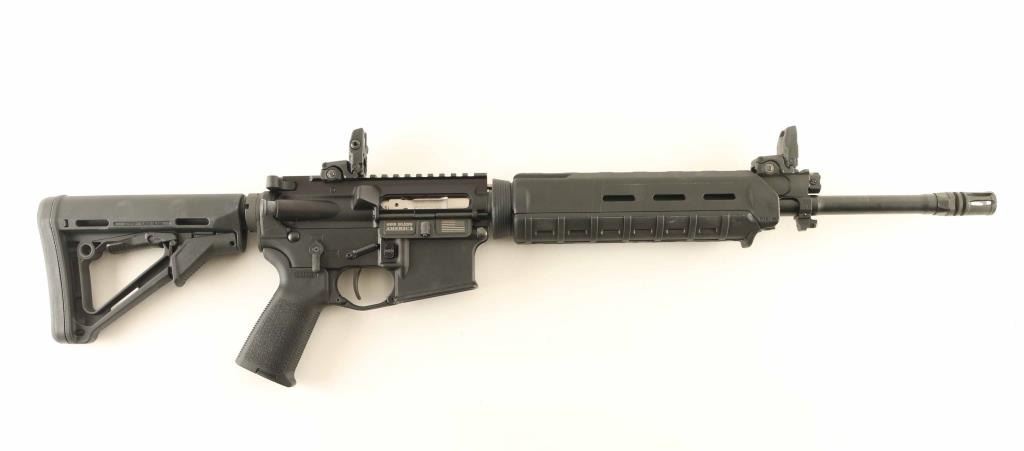 Rifle. Semi-Automatic. Patriot Ordnance Factory, Phoenix, AZ. Introduced 2015.Gas piston system. The system comes with a front key that is adjustable on 3 positions,normal, suppressed, and off. 7075-T6 aluminum alloy lower. 16.5" Chrome-Moly-Vanadium steel. Bird cage flash hider. Magpul MOE black pistol grip, handguard, and 6-position collapsible stock. MIL-Tec, hard anodized aluminum "Anti-Tilt" buffer tube. MBUS flip sights are mounted on the front and rear Picatinny rails. "God Bless America", and the American flag are on the ejection post cover. Bore appears excellent/bright. Action is crisp/tight. Matte metal finish , and synthetic furniture are excellent. Rifle appears in almost new condition. No Magazine. NRA Condition-Excellent. Modern Firearm.