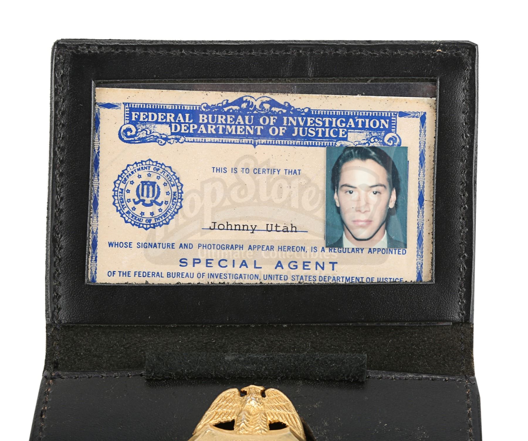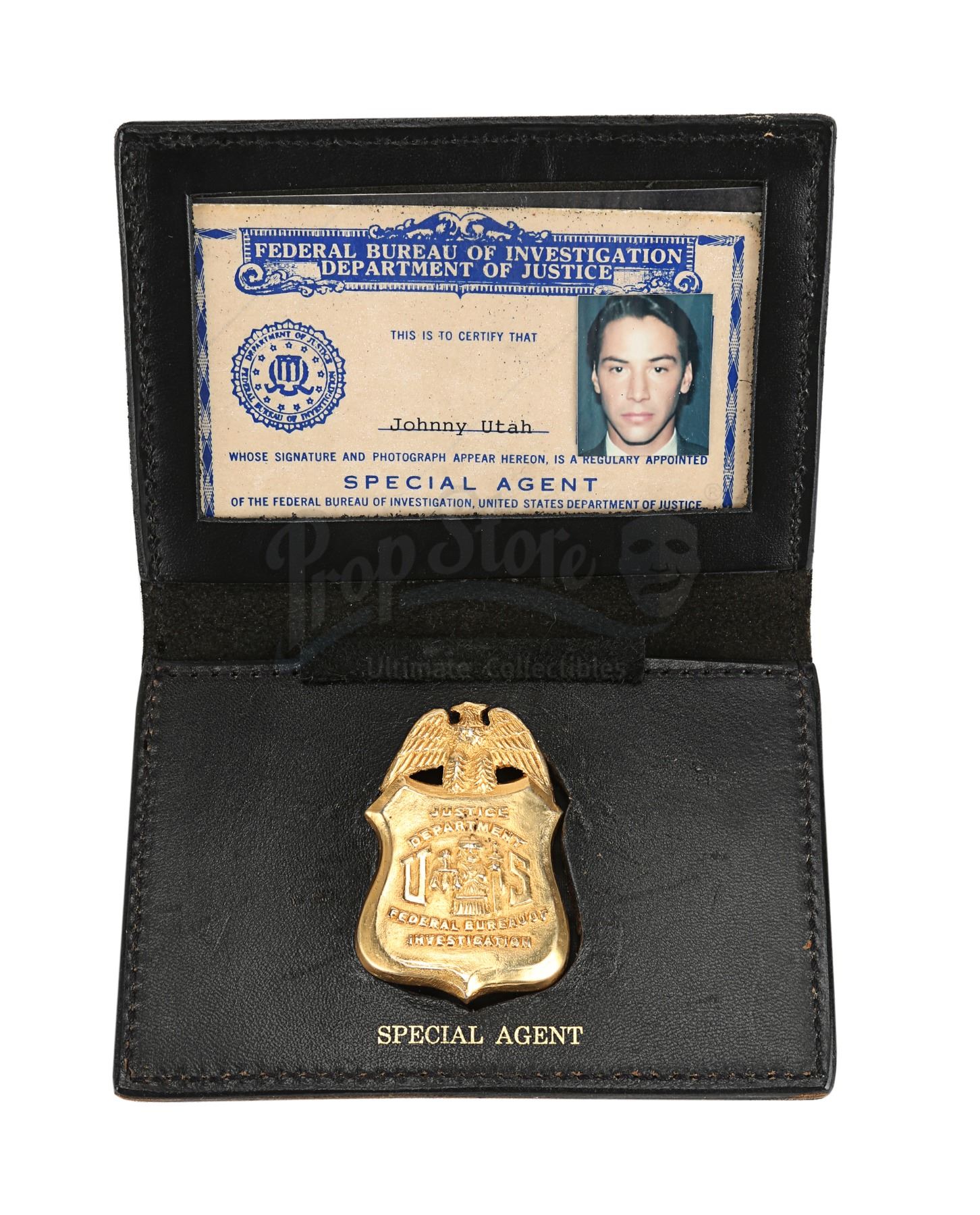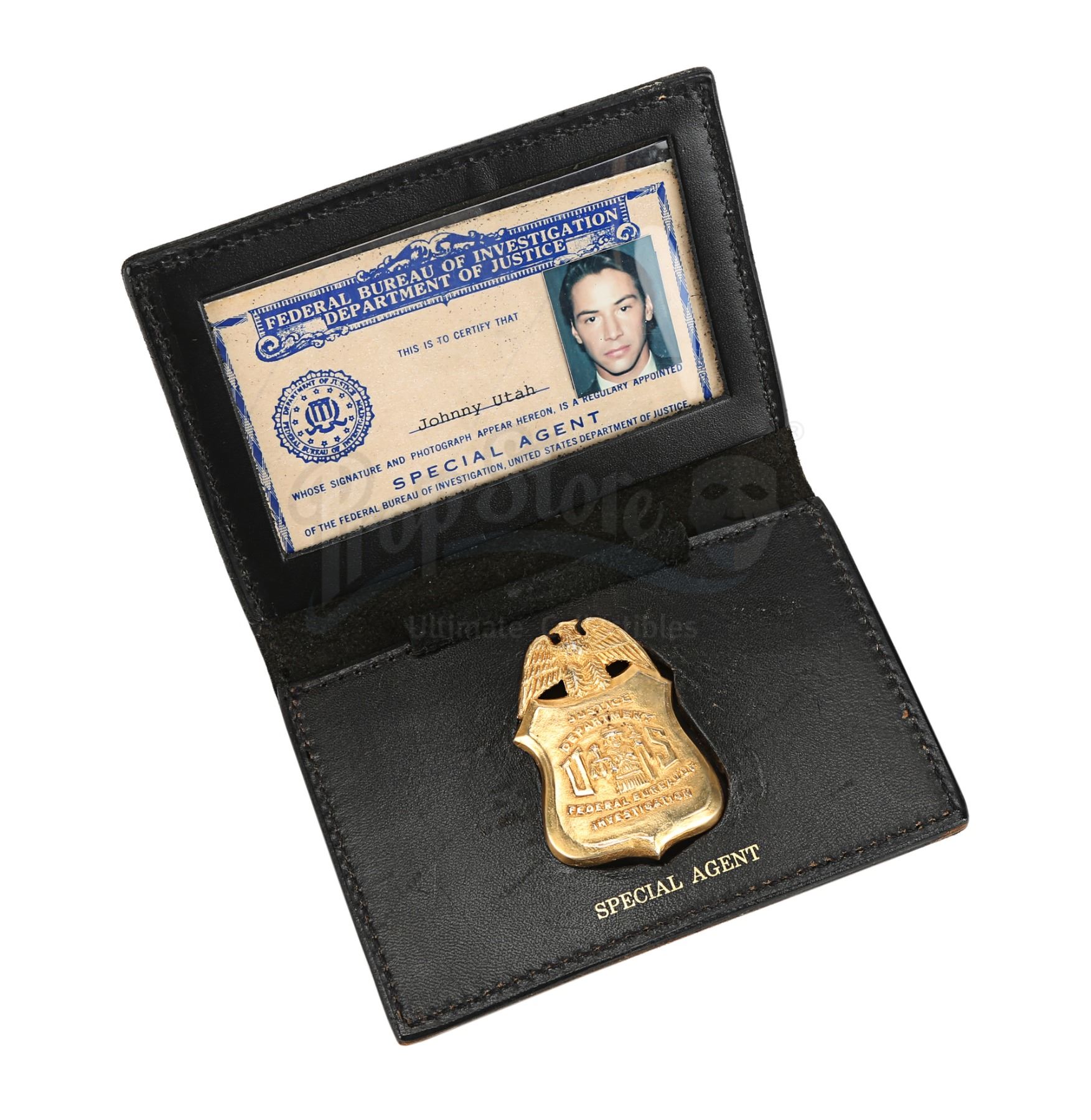 Johnny Utah's (Keanu Reeves) prototype FBI badge from Kathryn Bigelow's action thriller Point Break. Utah carried his badge while chasing the bank-robbing "Ex-Presidents", and threw his badge into the sea after letting Bodhi (Patrick Swayze) ride one final wave. This badge was a prototype, and different to the one ultimately seen in the final cut of the film.