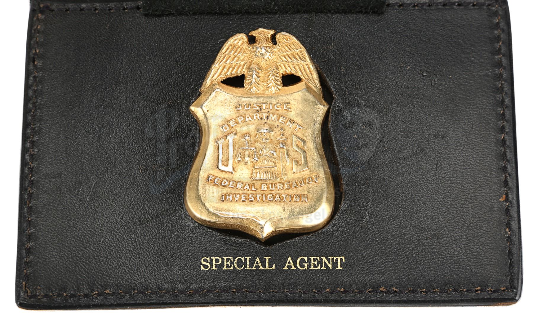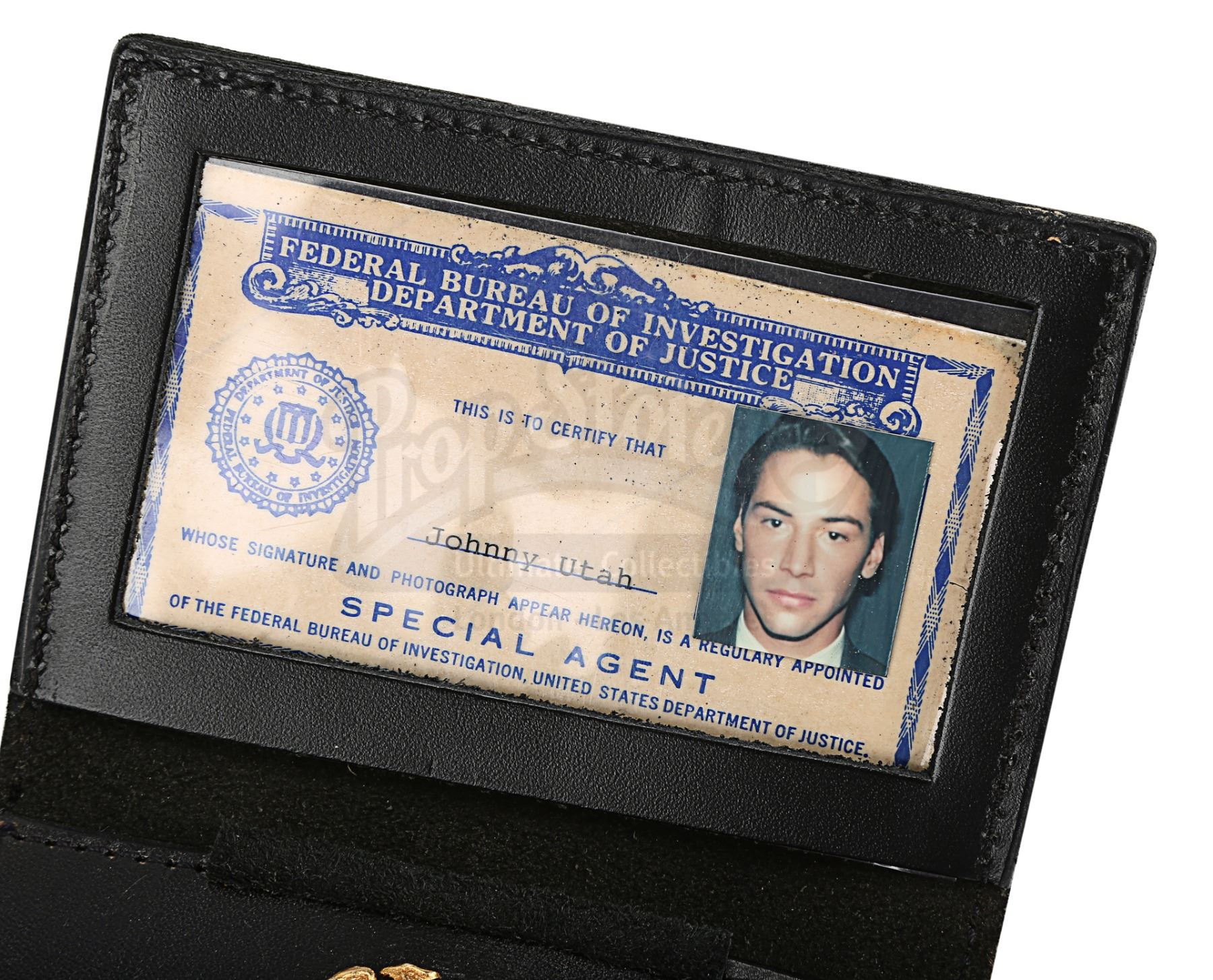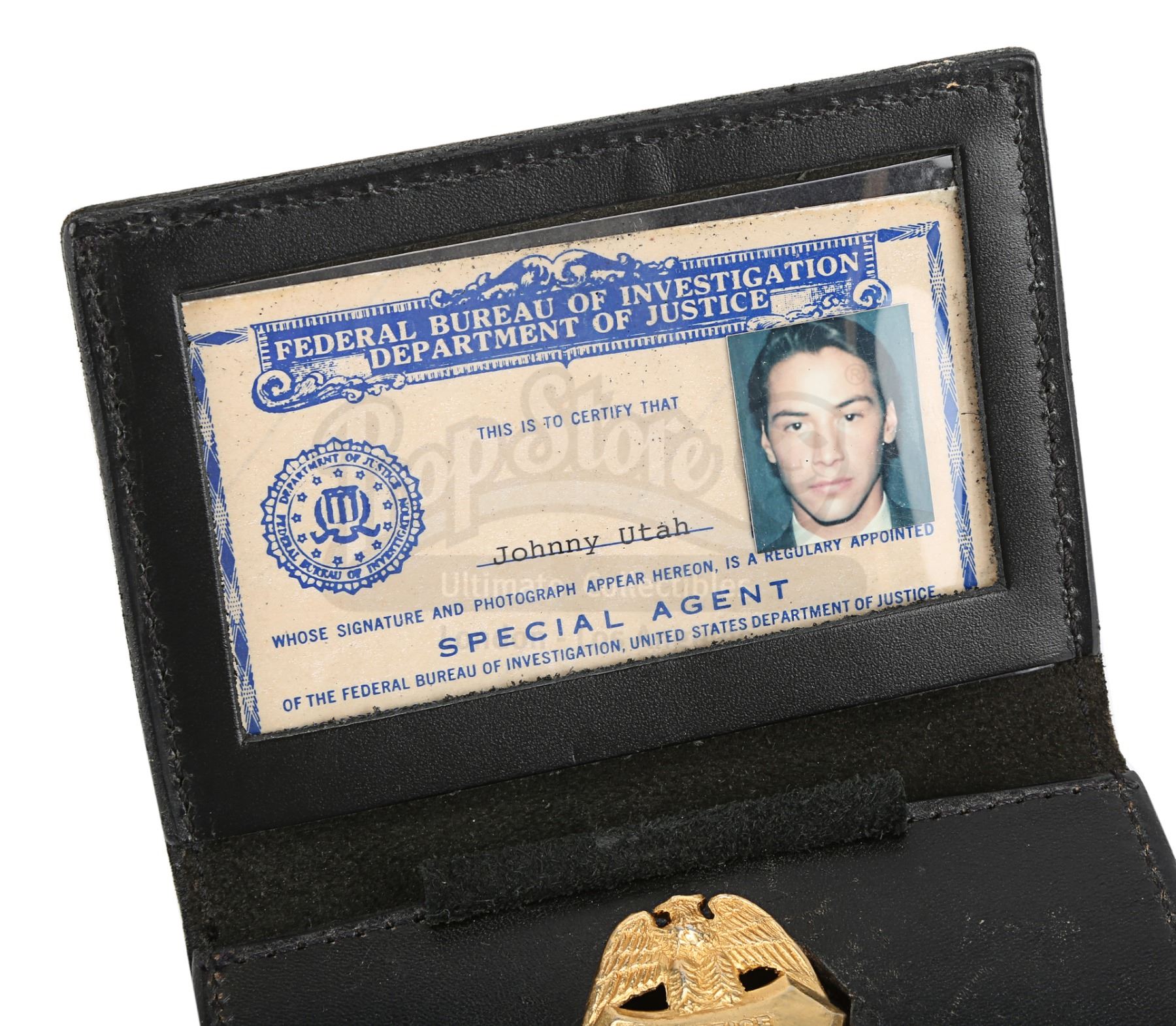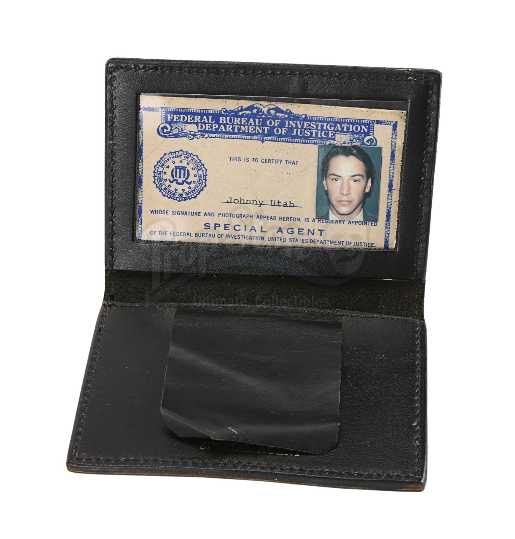 Johnny Utah's (Keanu Reeves) prototype FBI badge from Kathryn Bigelow's action thriller Point Break. Utah carried his badge while chasing the bank-robbing "Ex-Presidents", and threw his badge into the sea after letting Bodhi (Patrick Swayze) ride one final wave. This badge was a prototype, and different to the one ultimately seen in the final cut of the film.