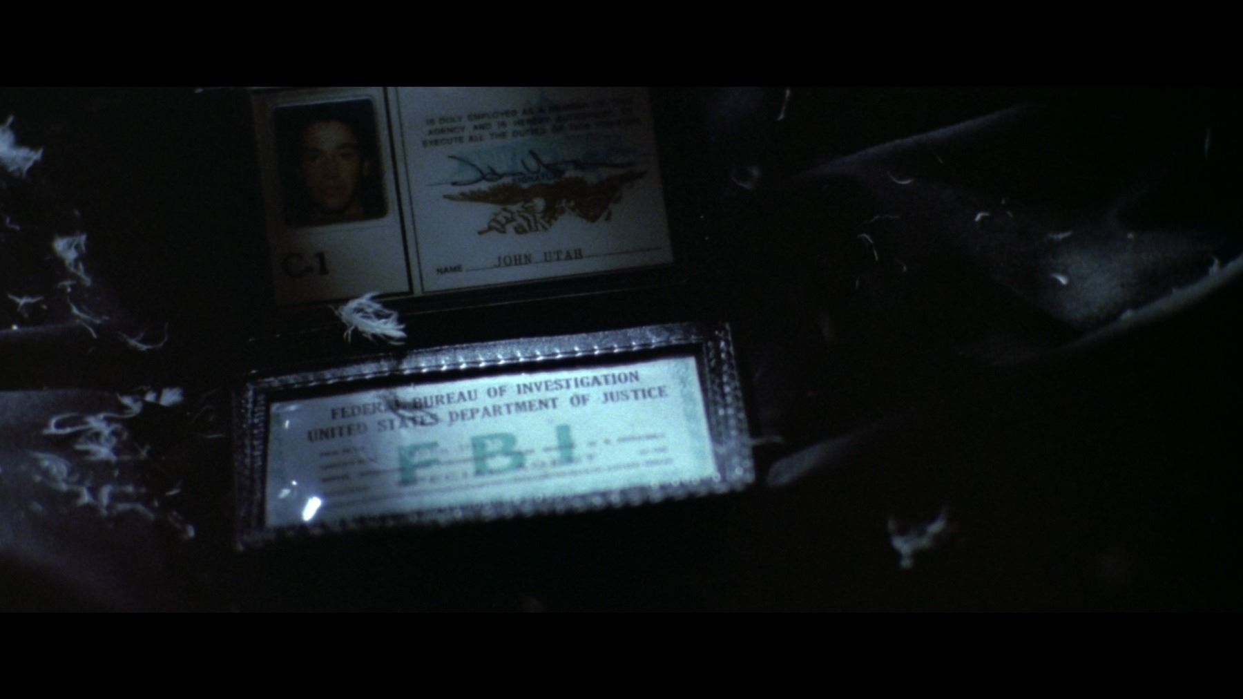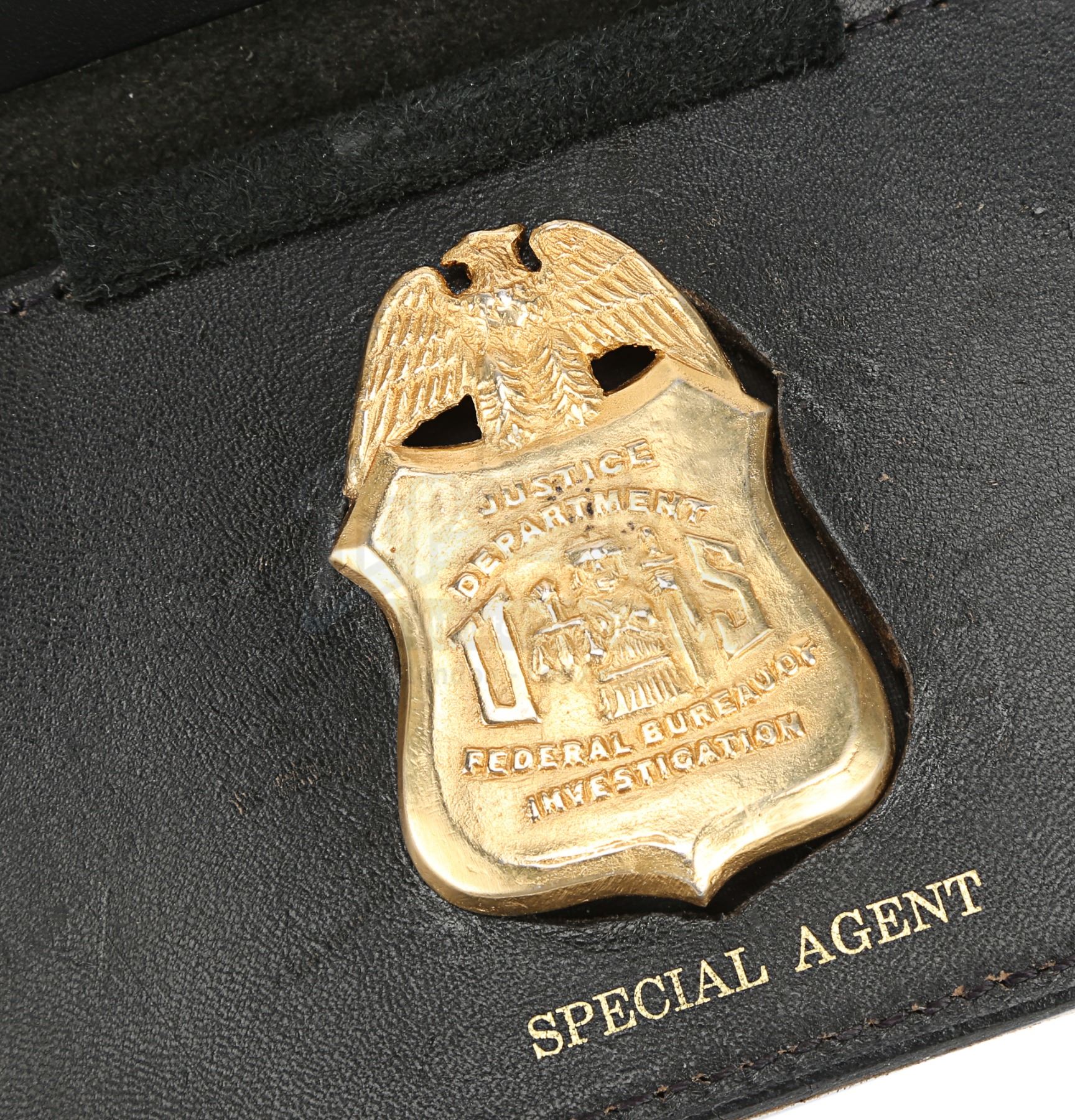 The metal badge sits in a leather wallet, opposite Utah's FBI ID card. The card features a picture of Utah alongside his name and rank of "Special Agent". The wallet features a small patch of black leather which covers the badge. The item has some scuffing and scratches from production use, most notably on the outside of the wallet. Dimensions (open): 19.5 cm x 9 cm x 0.5 cm (7 3/4" x 3 1/2" x 1/4")