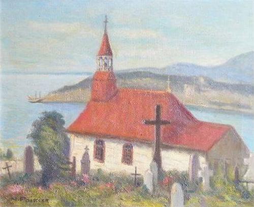 POIRIER, Narcisse, 1883-1983. "Église de Tadoussac". Huile sur toile, signée. Oil on canvas, signed. 16" x 20" - 40.6cm x 50.8cm.