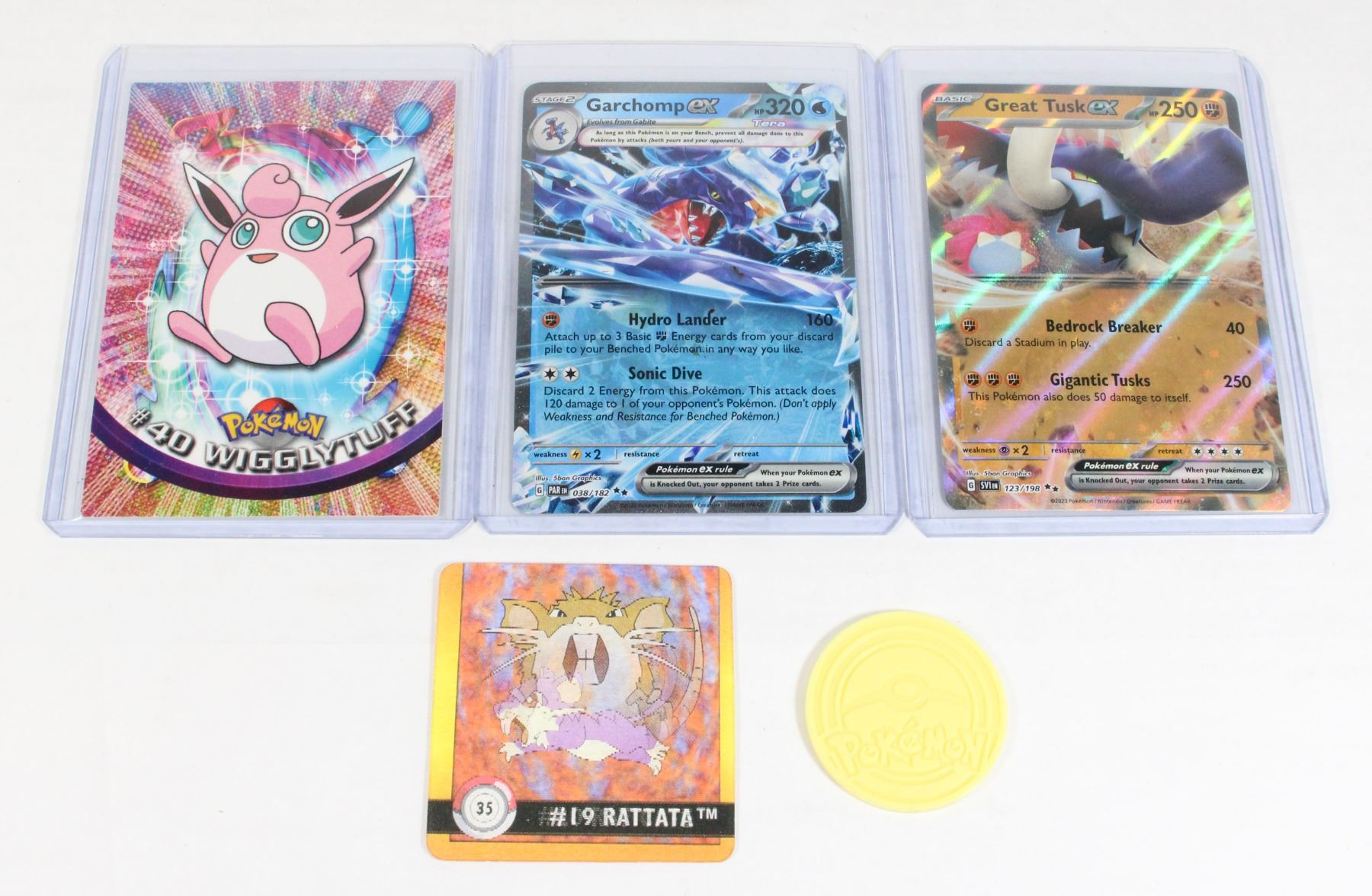 , POKÉMON CARD GREAT TUSK EX 123/198 2023,TOPPS POKÉMON #40 WIGGLYTUFF 1999 CARD, AND POKÉMON CARD GARCHOMP EX 238/182 2023
