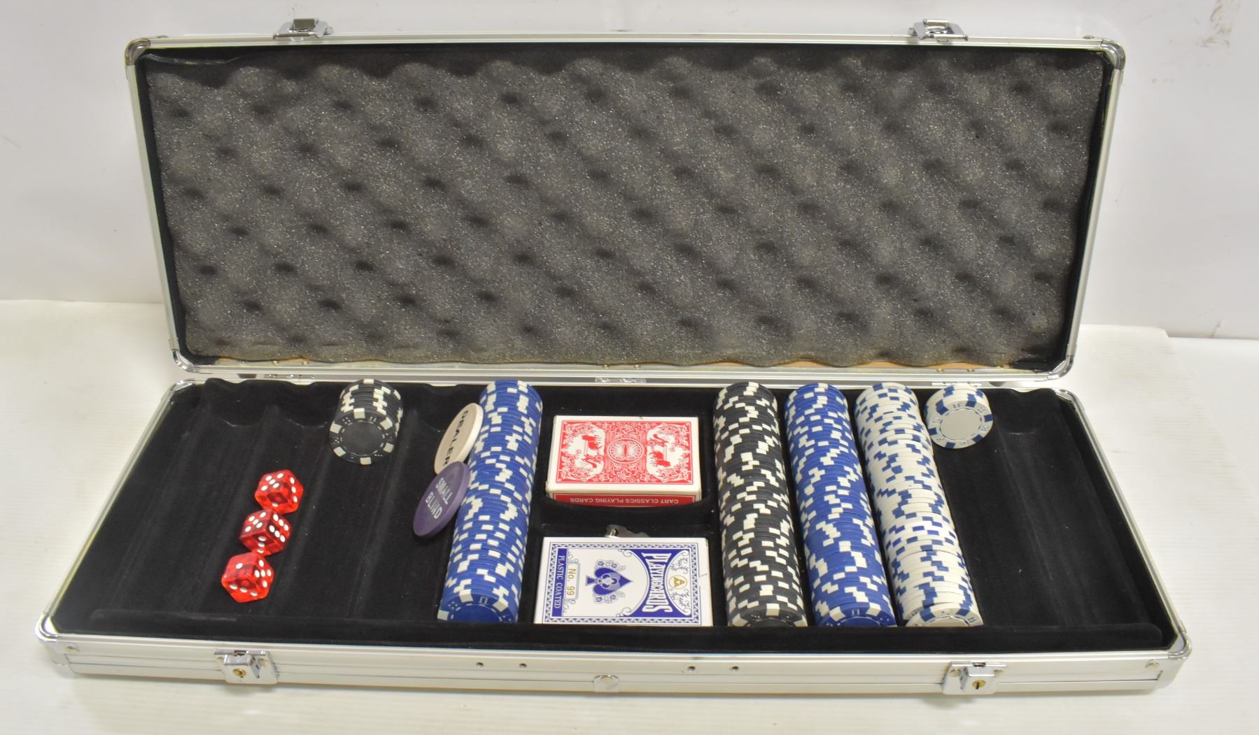 POKER CHIP CASE C/W KEYS, PLAYING CARDS AND CHIPS
