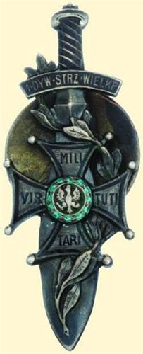 on reverse, maker's mark "SG". Excellent design and quality, very attractive! WES. 950 var.<BR><b>Country:</b> POLAND<BR><b>Type:</b> REGIMENTAL BADGES<BR><b>Group:</b> WIELKOPOLSKI UPRISING BADGES (GREAT POLAND)
