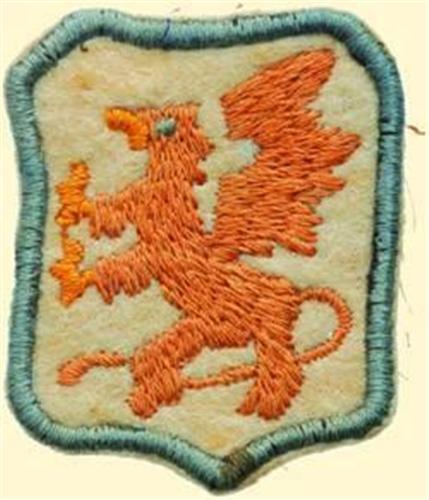Cloth insignia, white felt background with embroidered orange brown griffin and green-blue border,