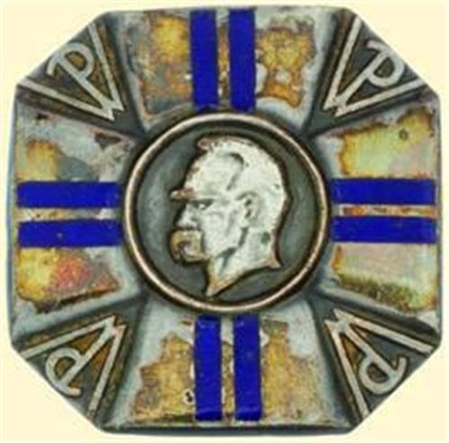 Tombak silver plated, obverse blue enamel-stripes, head of J.Pilsudski, one part construction with profile-
