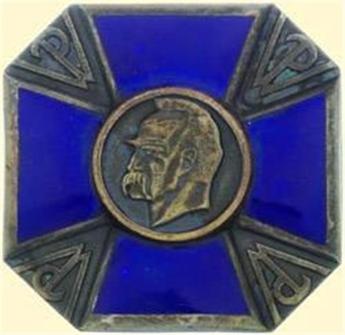 Tombak silver plated and patinated, obverse cross dark blue enamelled, head of J.Pilsudski, one part construction