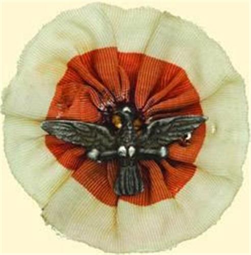 pin on reverse (is missing), mounted on white and red rosette of artificial silk. WES. 1361 similar.<BR><b>Country:</b> POLAND<BR><b>Type:</b> REGIMENTAL BADGES<BR><b>Group:</b> ADDENDUM