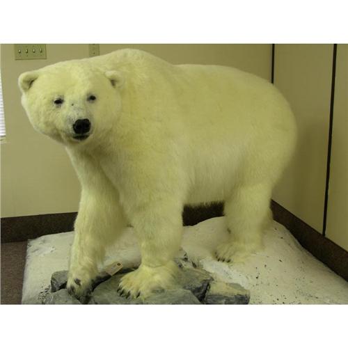 A most impressive stuffed and mounted polar bear, on a moulded styrofoam base depicting a polar landscape. Bear measures approximately 42" to the shoulder, and 65" long.