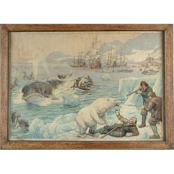 POLAR HUNTING EXPEDITION LITHOGRAPH. Illustration of Dutch Man-O-War ships and their crew whaling, set within an arctic landscape. Artist signed C. Jetses, 1910. SIZE: Image size: 40” w. x 28” h. CONDITION: Generally good with some fading, water stains, and surface scuffs. PF 1-4479 (200-400)