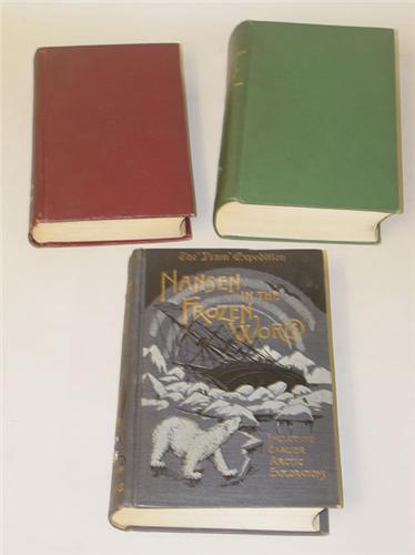 POLAR TRAVEL. A Group of 3 Volumes as Listed. 8vo - over 7¾" - 9¾" tall. Hard Cover. Ex-Library. Good + Condition. ***Through the First Antarctic Night 1898-1899 - A Narrative of the Voyage of the "Belgica" Among Newly Discovered Lands and Over an Unknown Sea About the South Pole by Frederick A. Cook (1900) NY: Doubleday & McClure Co. xxiv, 478pp in a library binding, illustrated throughout (lacks a few plates), binding & hinges tight. ***The "Fram" Expedition. Nansen in the Frozen World, arranged & edited by S.L. Berens (1897) Philadelphia: A.J. Holman & Co. viii, 560pp in original illustrated cloth cover, ILLUSTRATED THROUGHOUT, binding & hinges tight. ***The Open Polar Sea: A Narrative of a Voyage of Discovery Towards the North Pole, in the Schooner "United States" by Dr. I.I. Hayes (1867) NY: Hurd and Houghton. xxiv, 454pp in a library binding. Complete with all plates & TINTED MAPS. Frontis lacks tg, binding & hinges tight.