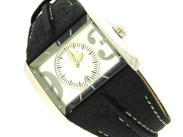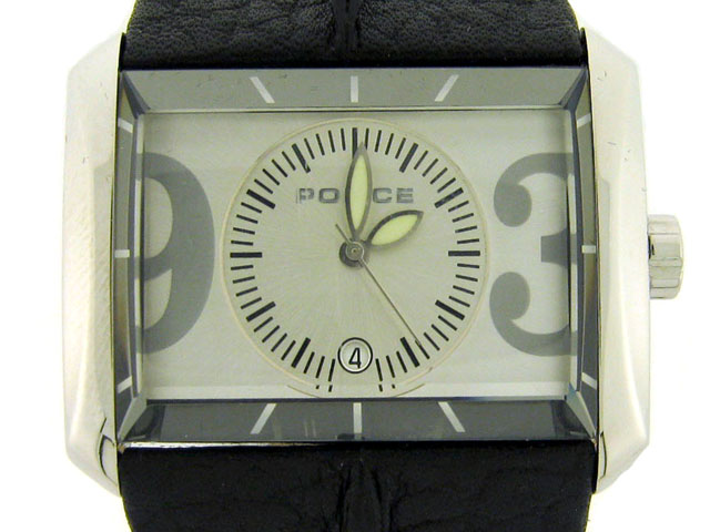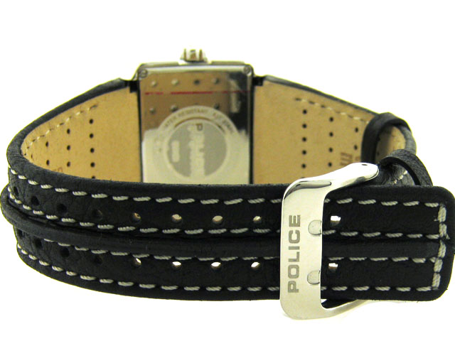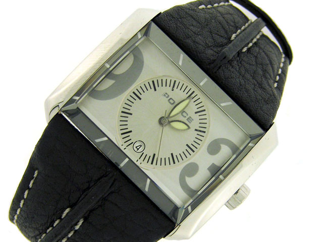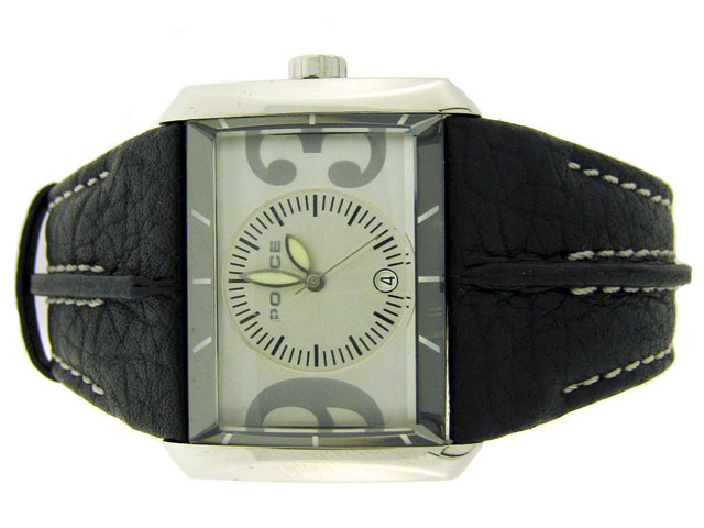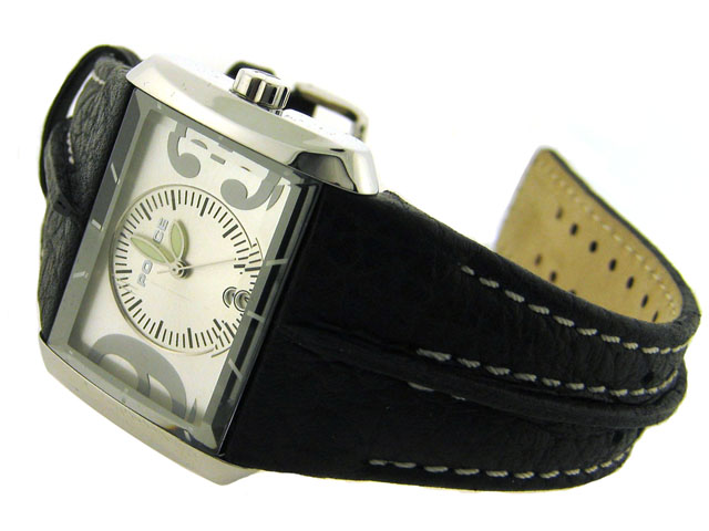 The watch has the following features: Quartz movement; Silver tone with Black markers Dial; 40 mm Case Diameter; and Leather strap with buckle.