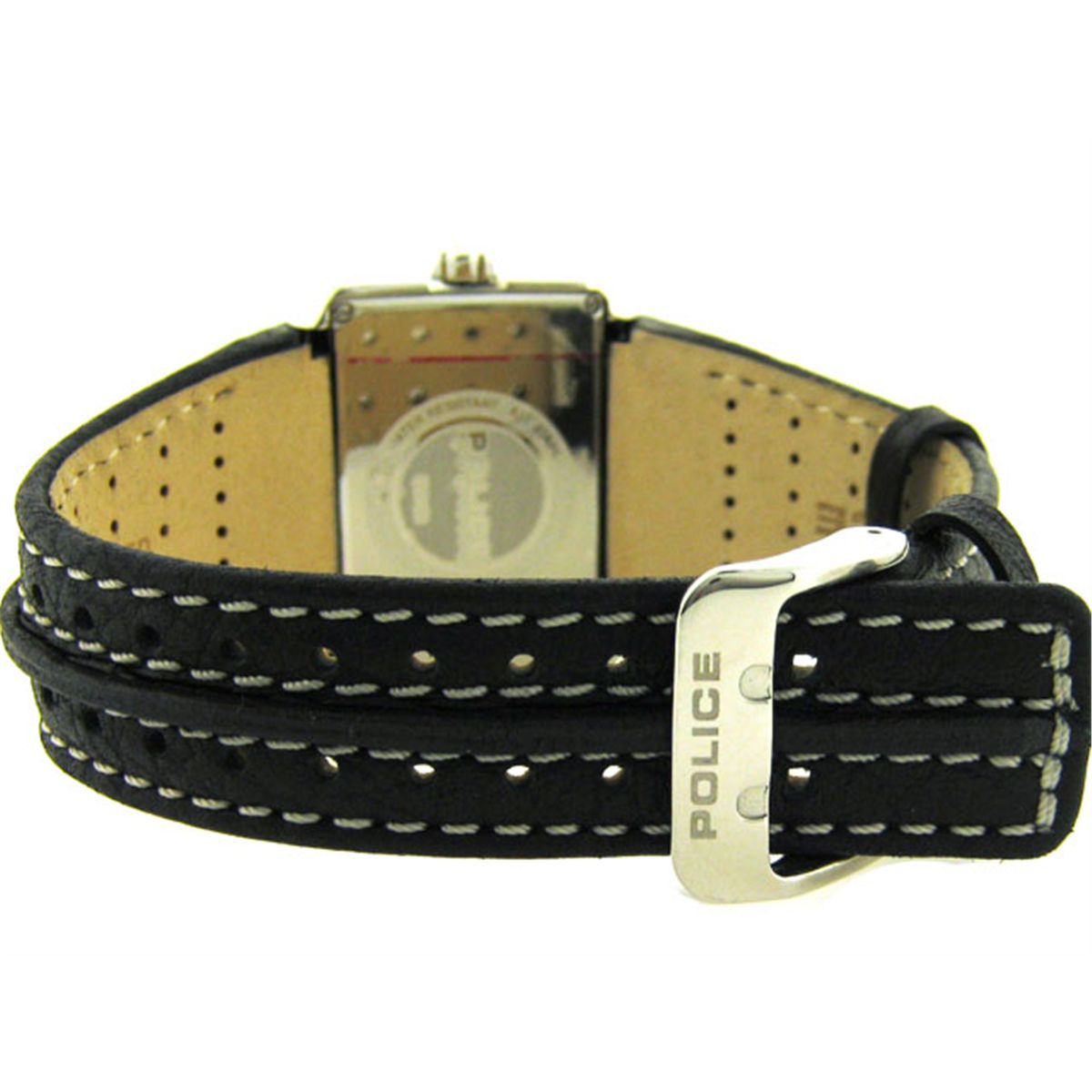 The watch has the following features: Quartz movement; Silver tone with Black markers Dial; 40 mm Case Diameter; and Leather strap with buckle.