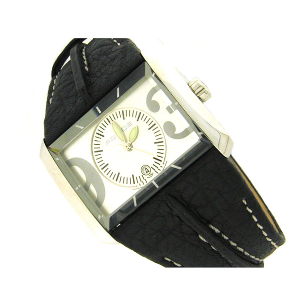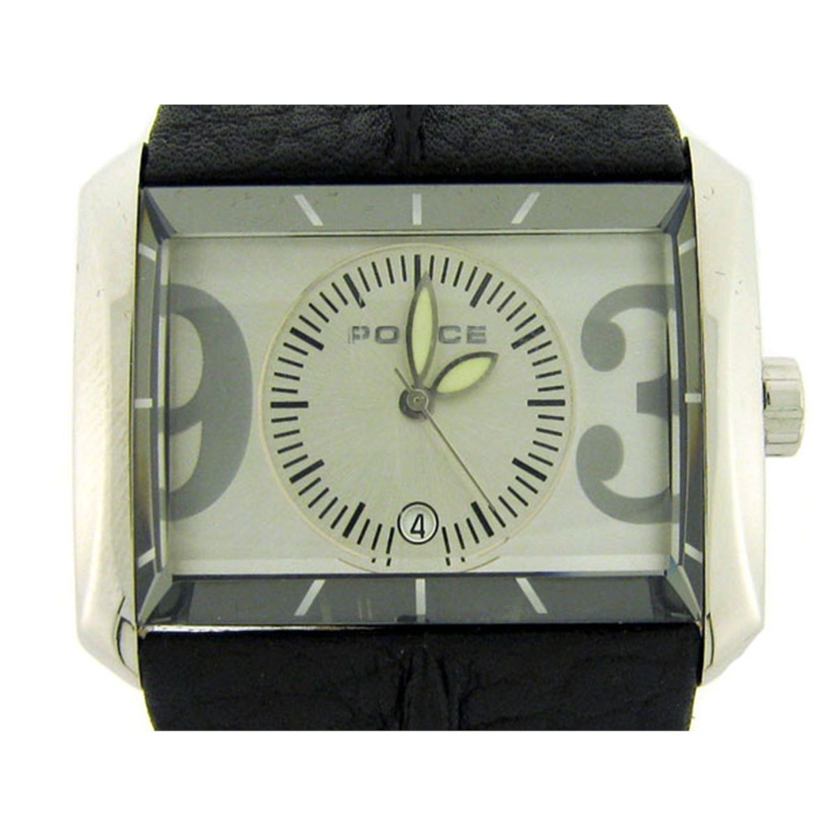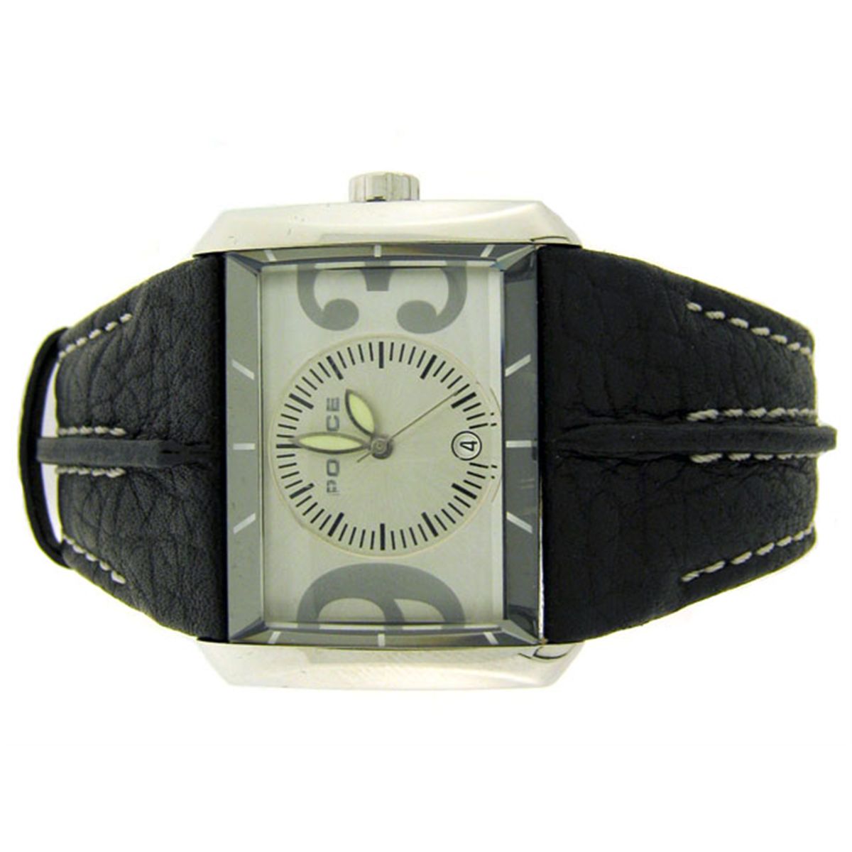 The watch has the following features: Quartz movement; Silver tone with Black markers Dial; 40 mm Case Diameter; and Leather strap with buckle.