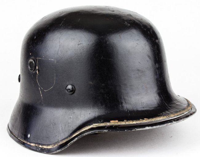 German police parade helmet, vulkanfibre, complete with padded liner, eight fingers with laces and four-point leather chin strap. Black paint remains fairly good, but insignia on either side have been removed and metal trim at front visor must be moved back into position. Size 54.