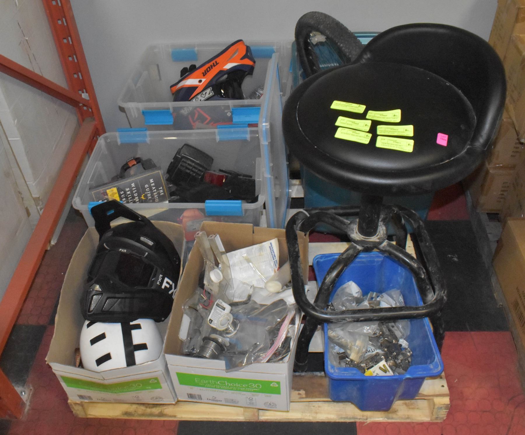 3 BOXES OF HARDWARE, TOOL STAND, BIKE TIRE, SEAT, BLACK STOOL, RETRO SPEC BIKE HELMET, FXR RACE HELMET, THOR SKIDOO HELMET. MUST BE REMOVED BY WEDNESDAY. **ALL ITEMS MUST BE REMOVED BY 5PM SATURDAY, MAY 20TH 2023. ALL REMAINING ITEMS WILL BE SUBJECT TO A $6.00 PER DAY STORAGE CHARGE. ANY ITEMS REMAINING AFTER MONDAY, JUNE 5TH, 2023 WILL BE CONSIDERED FORFEITED. NO REFUNDS WILL BE ISSUED FOR FORFEITED ITEMS. TO SCHEDULE A PICK UP APPOINTMENT CLICK HERE
