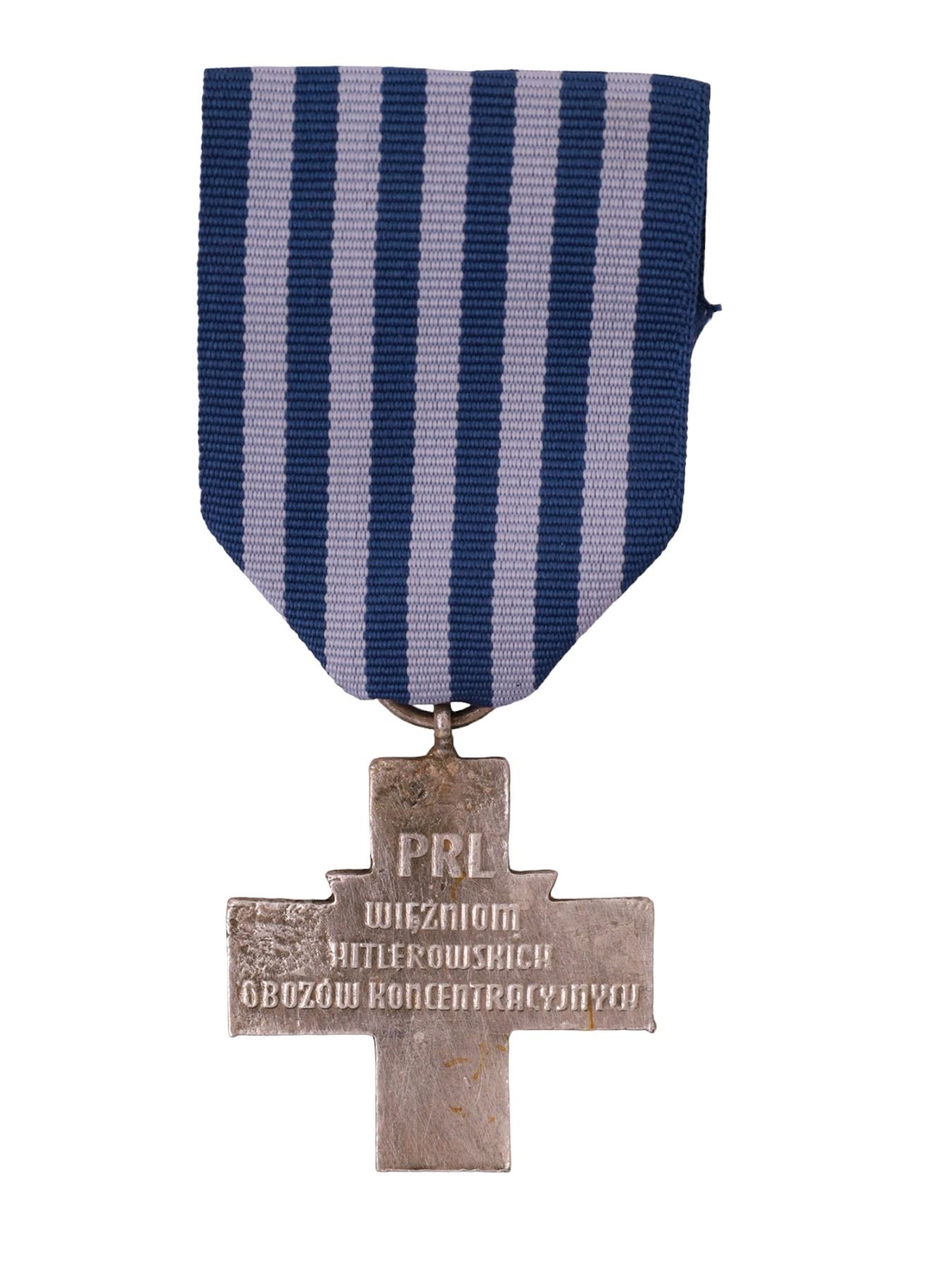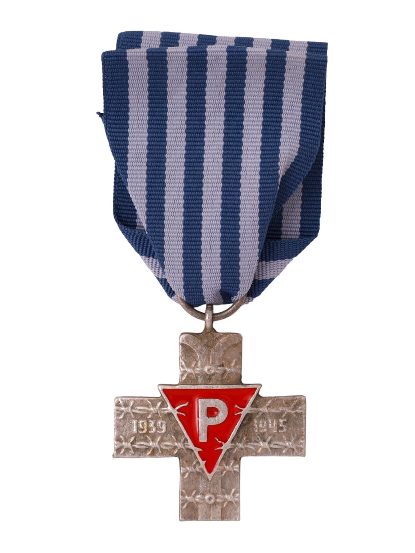 The Auschwitz Cross was instituted on 14 March 1985, a Polish decoration awarded to honor survivors of the Holocaust and German concentration camps, including Auschwitz. It was awarded generally to Poles, but it was possible to award it to foreigners in special cases. It could be awarded posthumously. It ceased to be awarded in 1999.The award is a silver Greek cross with wide arms. The obverse shows barbed wire and camp poles; the year 1939 on the left, and 1945 on the right arm. In the center there is a red triangle with the letter P, as worn by Polish nationals imprisoned in the camps. The reverse is inscribed 'PRL People's Republic of Poland to prisoners of Hitler's concentration camps.' Medal with blue and white ribbon.