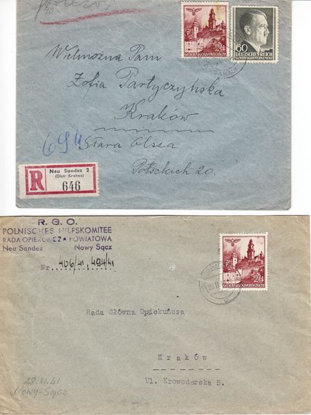 Lot of two rare postal covers originating from the Polish ghetto and 150-person forced labor camp site of Nowy Sacz (Neu Sandez), a city of around 20,000 people whose Jews were liquidated at Belzec over a three-day period in August 1942. Across the river in the Jewish Cemetery, 3-500 people were executed for their part in sheltering Jews of the city. The covers are both addressed to people in Krakow. One bears a registered mail sticker from Neu Sandez, the other a very rare rubber-stamp return address of the R.G.O. Polish Aid Committee of Neu Sandez. Fine.