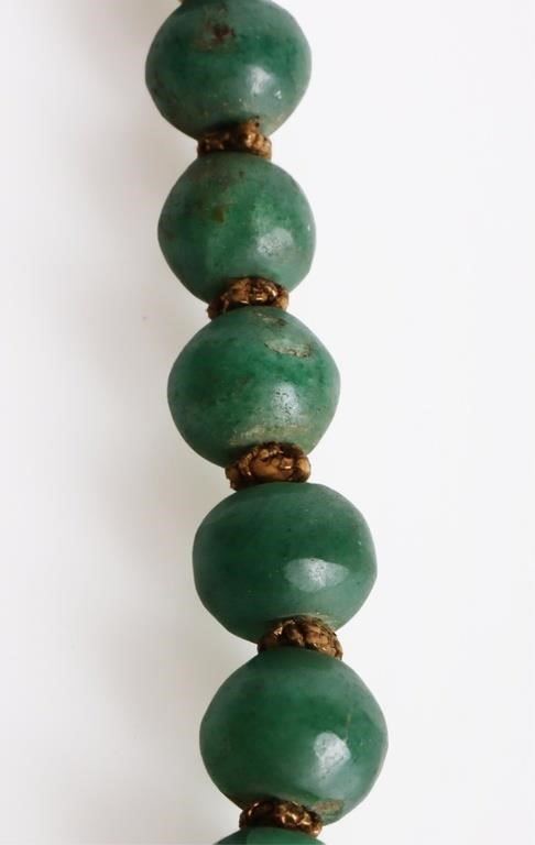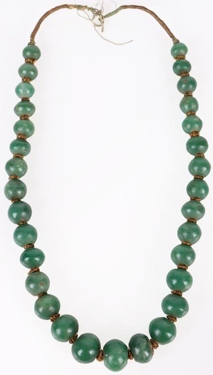 Polished round nephrite unisex necklace to include thirty-one various nephrite gemstones.