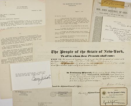 Lot of items signed by important politicians, includes: WILLIAM A. RICHARDSON, Sec. of the Treasury under Grant, an 1887 A.Q.S. quoting Longfellow: "...Thus at the flaming forge of life, Our fortunes must be wrought..."; WILLIAM H. SEWARD, D.S., Oct. 29, 1841, a commission of a lieutenant, co-signed by RUFUS KING, toned spots; FIORELLO LAGUARDIA, T.L.S. as mayor, 2pp. 4to., re: balancing New York's budget; BARRY GOLDWATER T.Q.S. on a small sheet, in part: "...Somebody sent me a book about death the other day. I threw it away..."; JOHN SHERMAN, cut signature affixed to the top of the first page of the official printing of his Apr. 13, 1860 address at Cooper Union; a rubber-stamped letter by James Forrestal thanking a sailor for his service, and a Lyndon Johnson secretarially-signed pass to the Senate. Overall very good. 7 pcs.