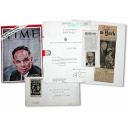 <b>886. POLITICS AND NOTABLES </b> Lot of eight pieces including <b>CARL VINSON</b>, signature on a mounted news clipping, mounted; <b>JOHN GLENN</b>, signature on the top of a news clipping from the <i>New York Times</i>, dated Jun. 18, 1964 concerning his first run for Senate, mounted; Atomic Energy Chairman <b>GLENN SEABORG</b>, signature on a cover of <i>Time</i> magazine bearing his image, mounted<b>; ALF LANDON</b>, signature and sentiment on a small card, mounted with a news clipping also bearing his signature; Canadian Prime Minister <b>PIERRE TRUDEAU</b>, signature on a card taped to a larger sheet bearing the transmittal letter and envelope; <b>MATHEW RIDGWAY</b>, signature and sentiment on a small sheet dated Aug. 9, 1969; <b>MARGARET CHASE SMITH</b>, signature on the top of a news clipping dated Jan. 28, 1964 bearing a headline noting her decision to seek the Republican nomination for President. Seven pieces, good to very good.<b>$75-100</b>