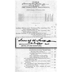 (1795 - 1849) Eleventh President of the United States who led the country during the Mexican-American War, and secured the territories of Oregon and Washington. Scarce signed leather-bound book, being the proceedings of the Third Session of the Twenety-Fifth U.S. Congress, [printed by Blair & Rives, Washington, 1839], boldly signed "James K. Polk" on the front pastedown, and again at the top of the Index at the start of the text. De-accessioned by the Tennessee State Library and bears the library's ink stamp on front flyleaf. Covers bear some wear and scuffs, light scattered foxing within, overall very good.