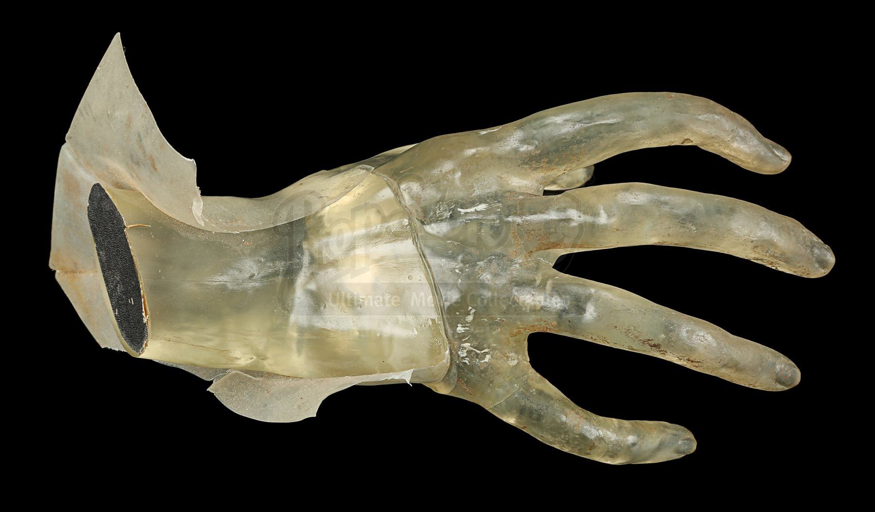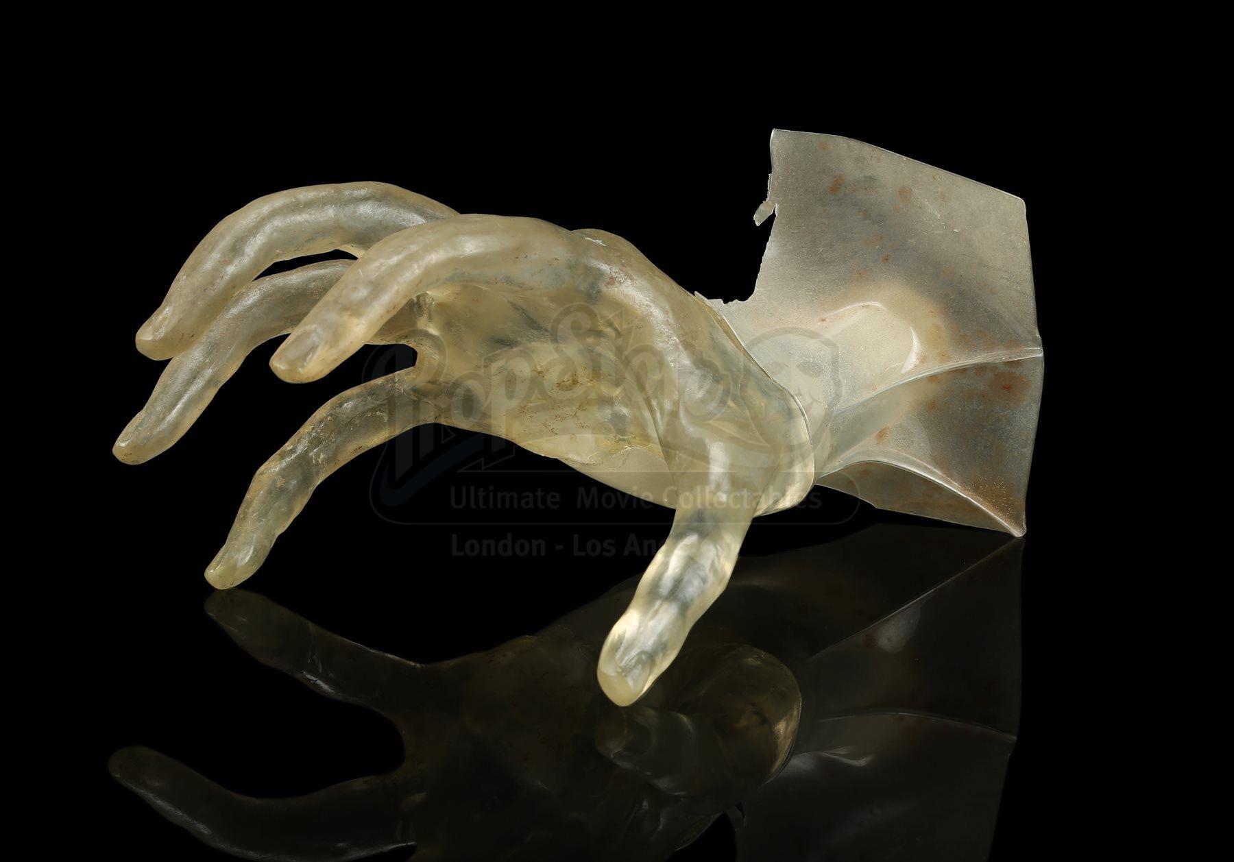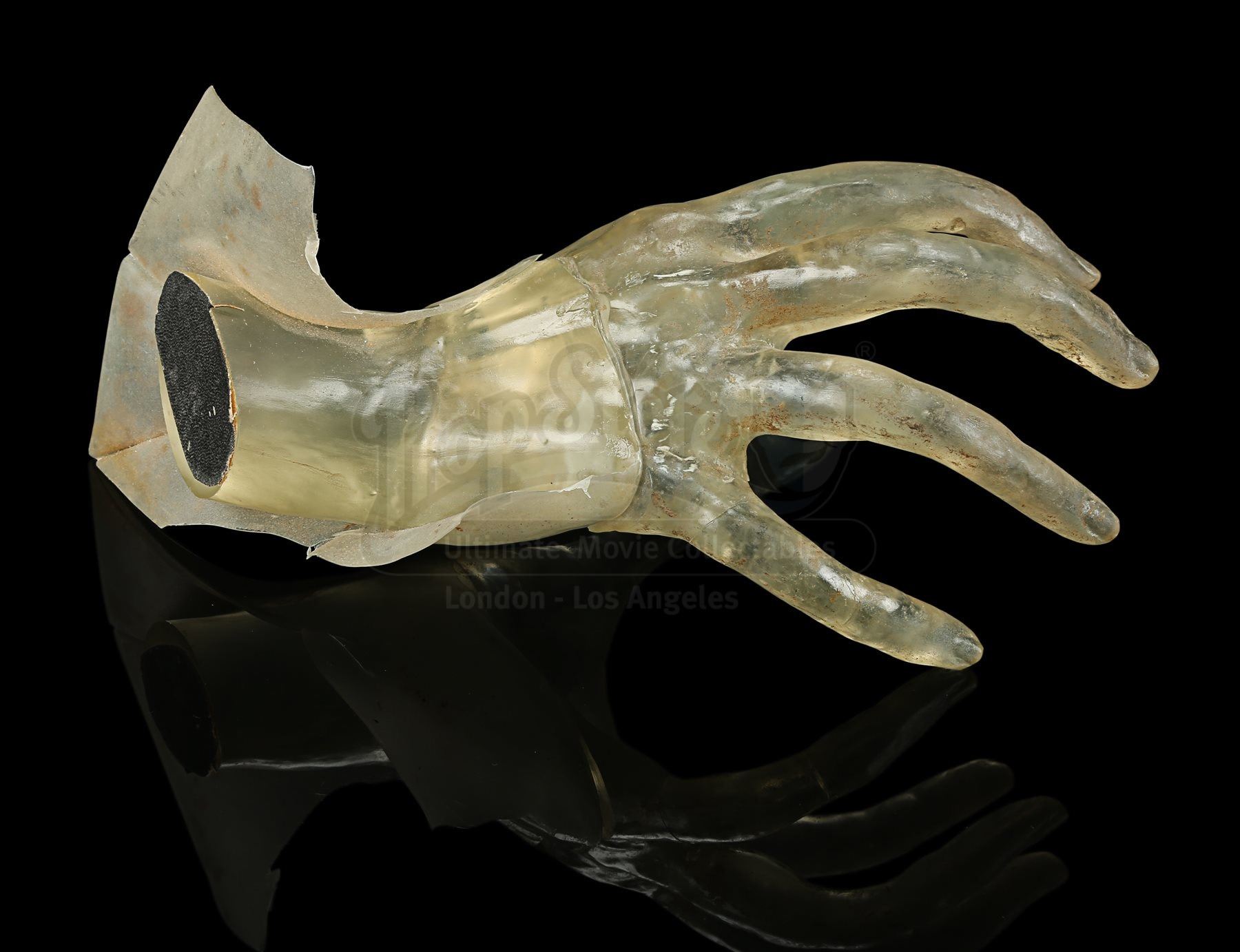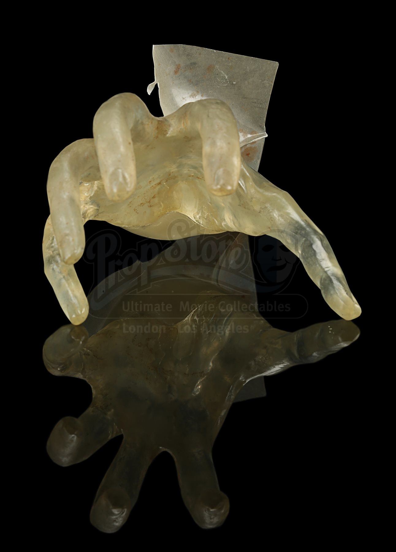 Made from clear yellow-tinted acrylic, the hand features long, skeletal fingers stretching outward, with a piece of black tape adhered to the end of the wrist. Excess stretched acrylic extends over the wrist to make it look as though the hand is reaching through the screen. It shows evidence of wear from production use, including cracked edges on the covering acrylic and stains throughout. Dimensions: 22 cm x 15 cm x 10 cm (8 ¾” x 6” x 4”)