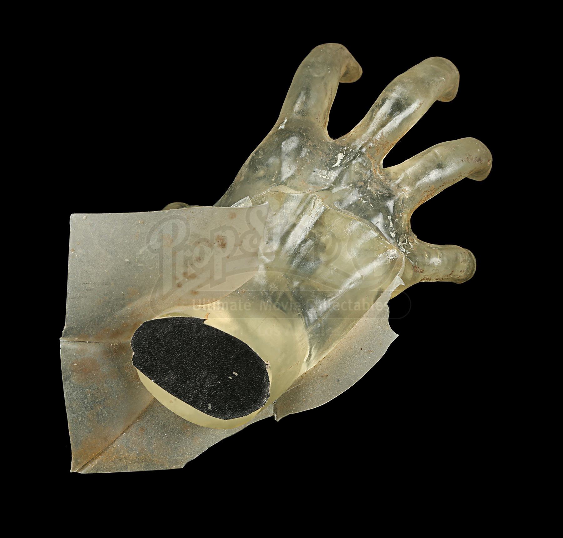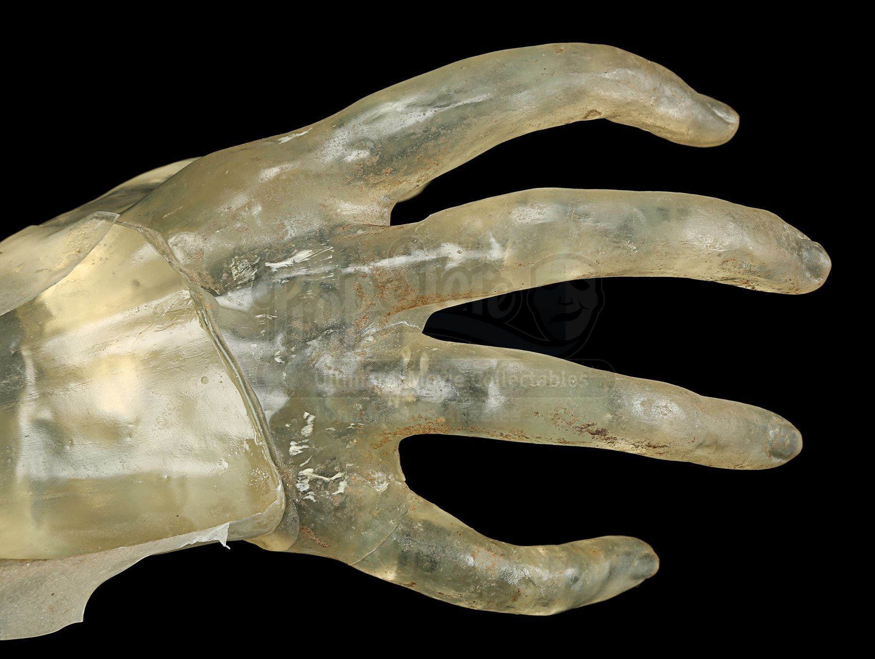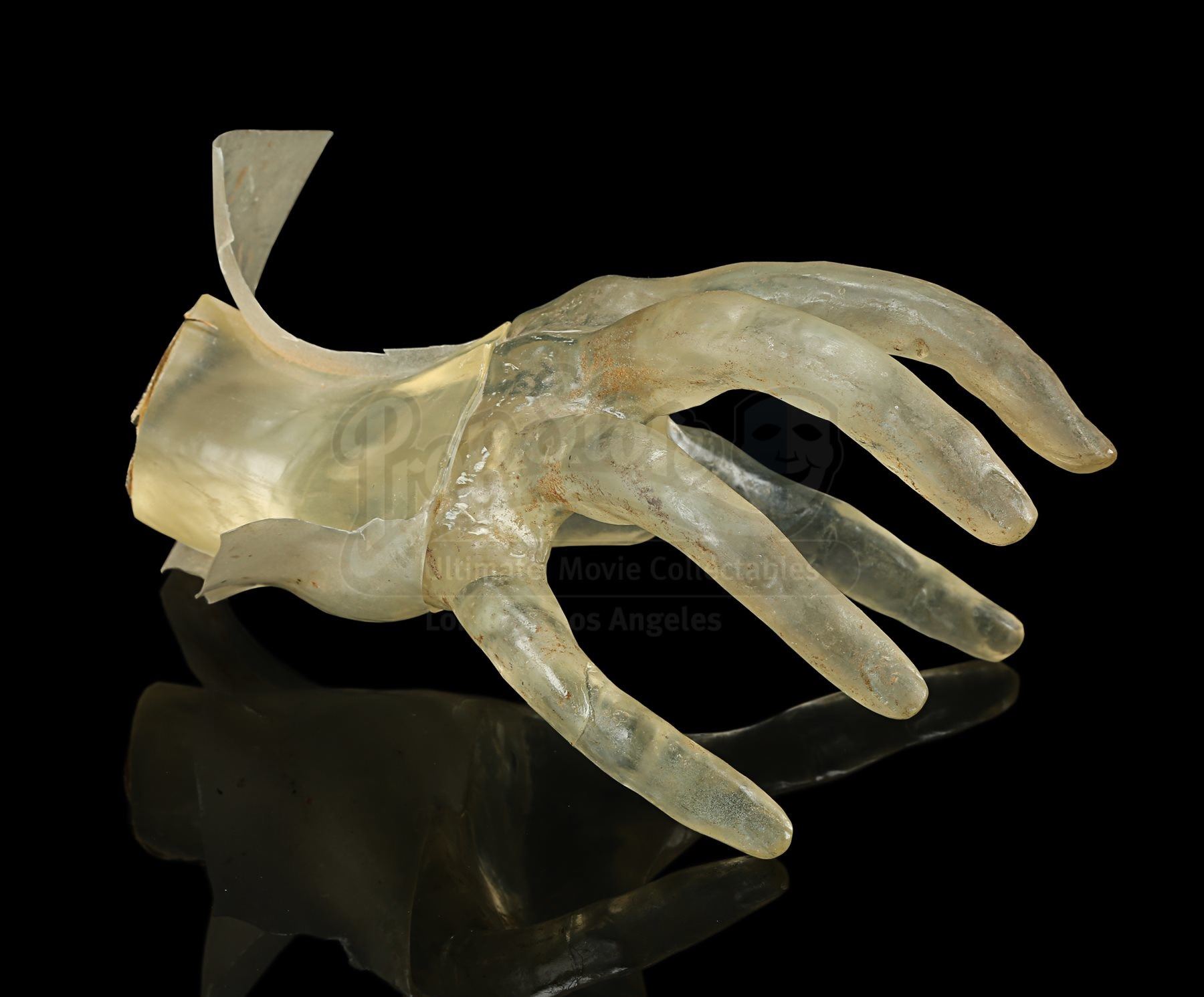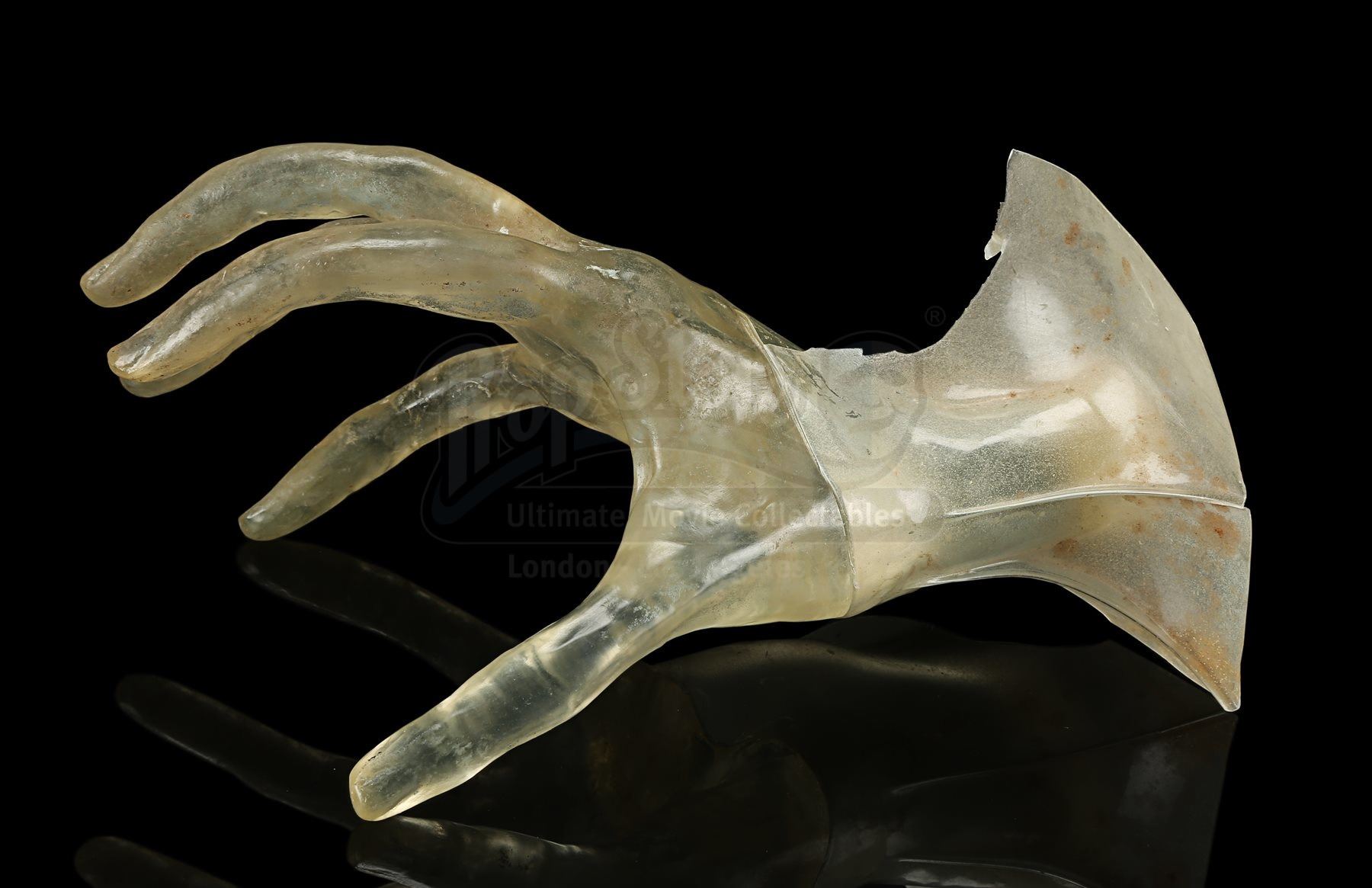 Made from clear yellow-tinted acrylic, the hand features long, skeletal fingers stretching outward, with a piece of black tape adhered to the end of the wrist. Excess stretched acrylic extends over the wrist to make it look as though the hand is reaching through the screen. It shows evidence of wear from production use, including cracked edges on the covering acrylic and stains throughout. Dimensions: 22 cm x 15 cm x 10 cm (8 ¾” x 6” x 4”)