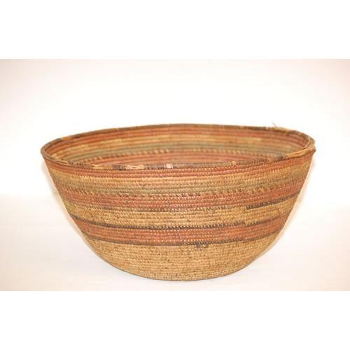 POLYCHROME BANDED COILED BASKET - LARGE BOWL SHAPE W/ ALTERNATING RED, GREEN, BROWN & NATURAL COLOR BANDS- 19TH-EARLY 20TH CENT., ORIGIN UNKNOWN (8 1/2" T X 17" W) - WEAR, RIM LOSSES, SAGGING
