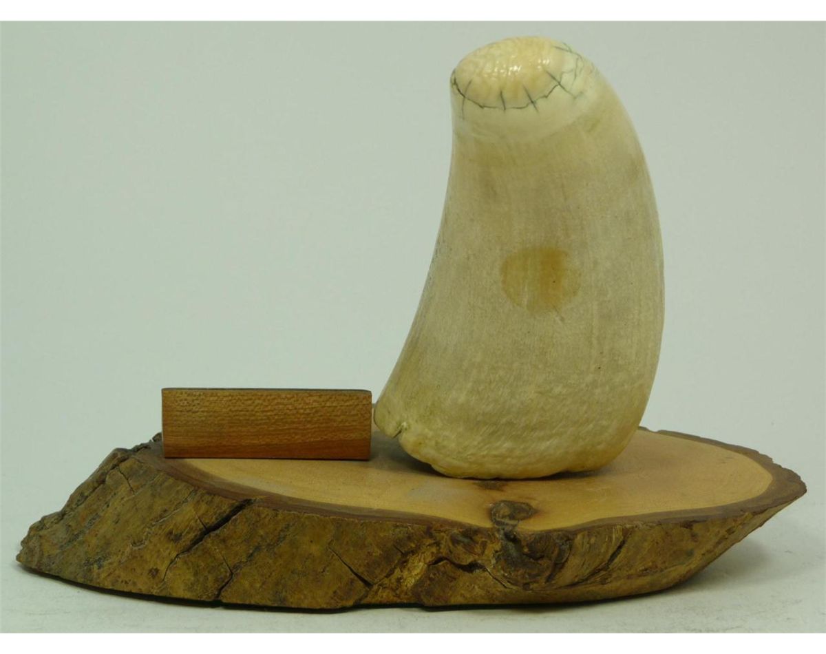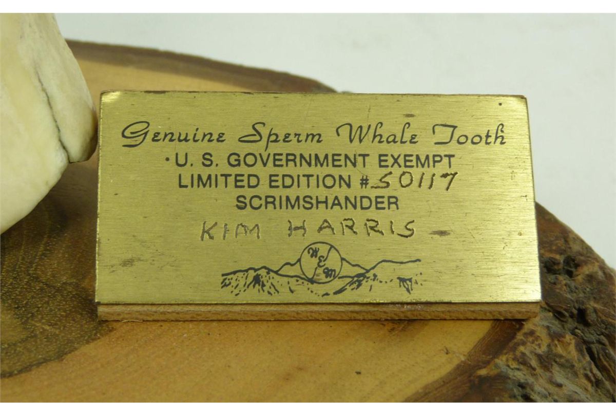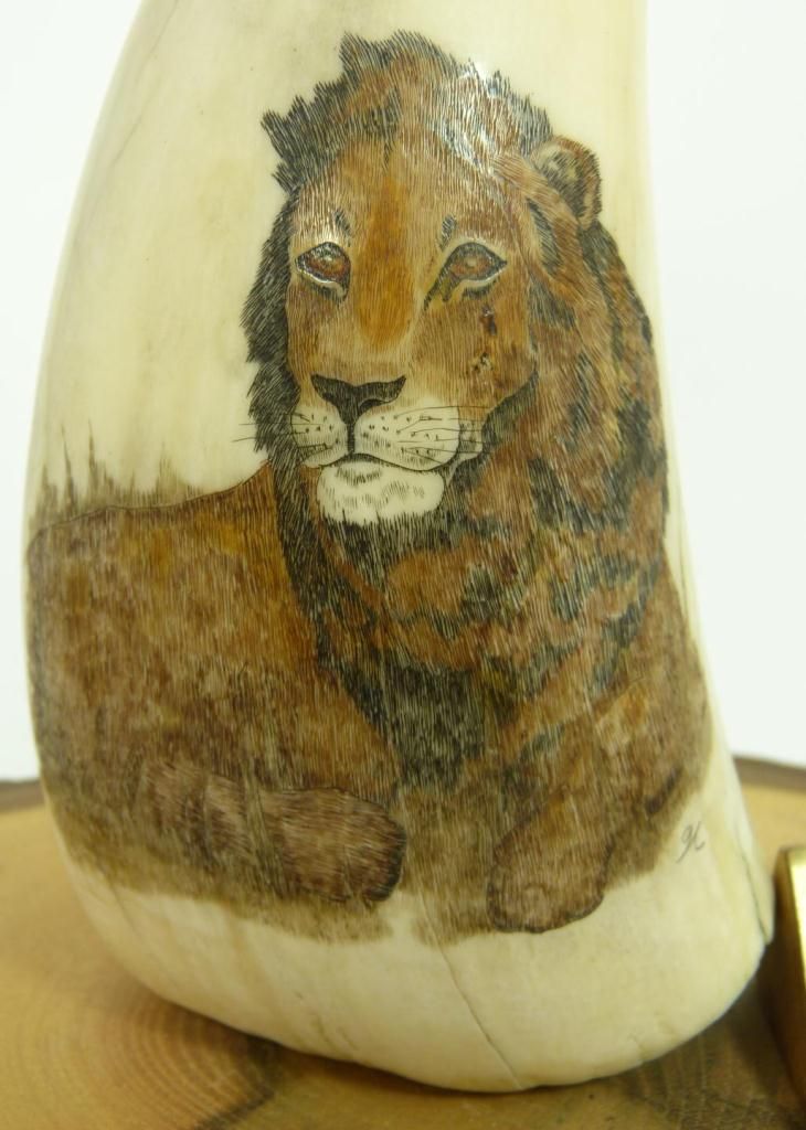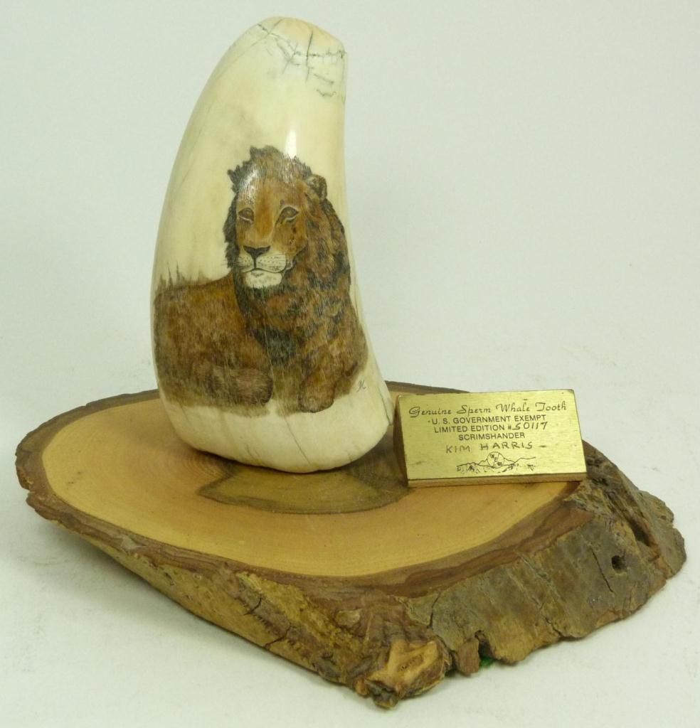American Scrimshaw depicting a recumbent lion. Mounted on wooden base. Includes placard stating 'Genuine Sperm Whale Tooth - US GOVERNMENT EXEMPT LIMITED EDITION #50117 SCRIMSHANDER KIM HARRIS'. Initialed 'H' to tooth under image. Tooth measures 4 5/8" height (11.7cm). Tooth weighs approx. 300 grams.