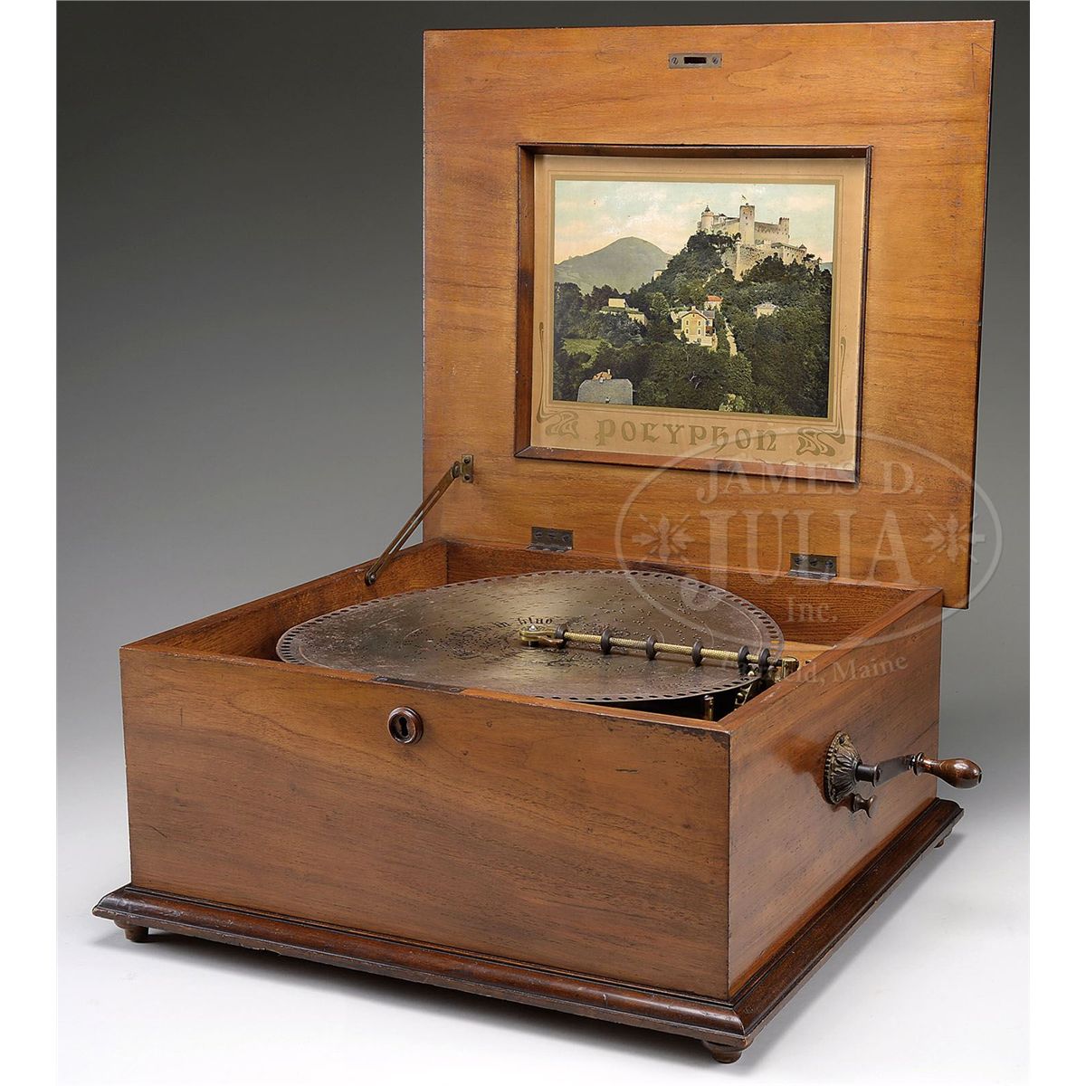 Beautiful walnut cased disc music box with 32 discs. Original picture inside lid with name Polyphon. Lid has diamond matched veneer with multicolor inlay and a rosewood flower with leaves with string inlay border framed by high relief molding. Case is on short legs for tone resonance. Movement appears unrestored but in very nice original condition. Has a tempo regulator. Single comb and dampers sound good. Has beautiful crystal clear tone. Bed plate has fancy casting with Polyphon cast into it. SIZE: 21" w x 19" d x 10" t. CONDITION: Case is all original, very nice, could use detailing and polishing to be immaculate. Works are completely original. A cleaning and polishing would make a museum piece. Has original crank. 1-13381