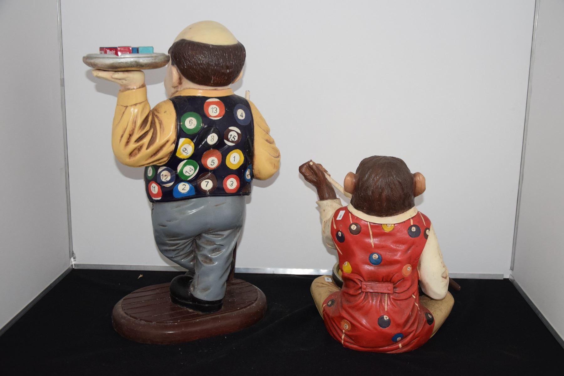 POOL PLAYER FIGURES, "MAN & MONKEY", W/POOL BALLS & CHALK