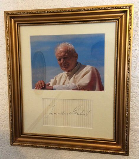 Giovanni Paolo II signed lined paper. Professionally mounted and framed in a gold coloured solid wood frame, preserving this rare piece. Size of paper is 18x13cm's. Supplied with coa.