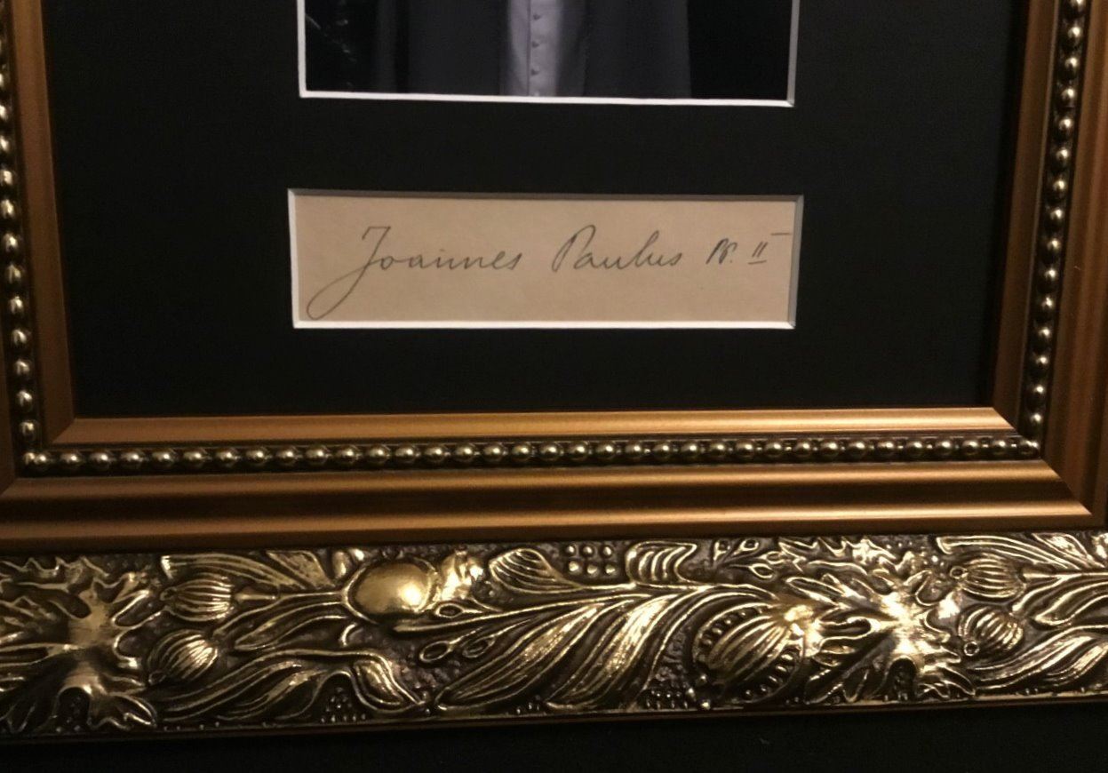 An autographed cutting by John Paul II in biro. Professionally mounted and framed. Supplied with coa.