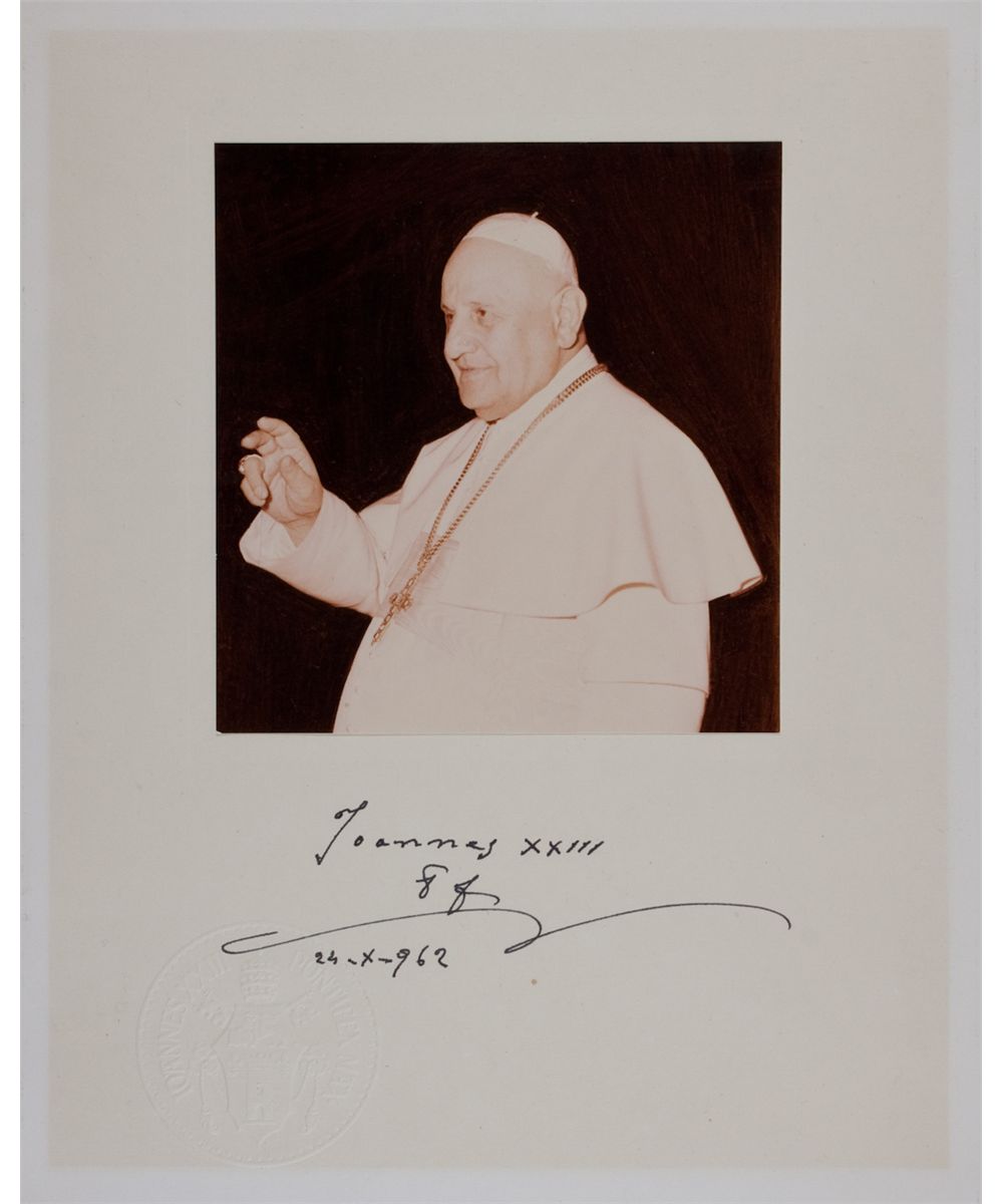 (1881-1963) Pope from 1958-1963, remembered for his significant efforts to save Jews during the Holocaust and later for calling the Second Vatican Council. Rare S.P., a 5 1/2" x 6" color image of the Pope mid-blessing, mounted to a 10" x 14" sheet blind-embossed with his seal and signed beneath image: "Johannes XXIII 24-X-962". Light offsetting, photo requires remounting, otherwise very good condition and set into a simple mat.
