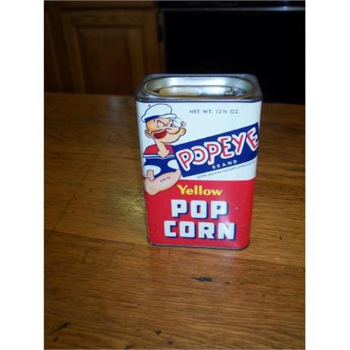 </font></strong>Wonderful tin from the 40s.Great colors and graphics.Popeye Brand Yellow Pop Corn.Has directions on one side and Popcorn Ball recipe on another.Great little cover also.Measures 4 3/4" tall by 3 1/4" across the front.Rare tin and in this great condition.</font>