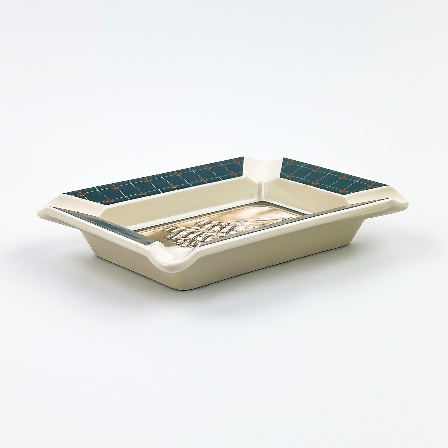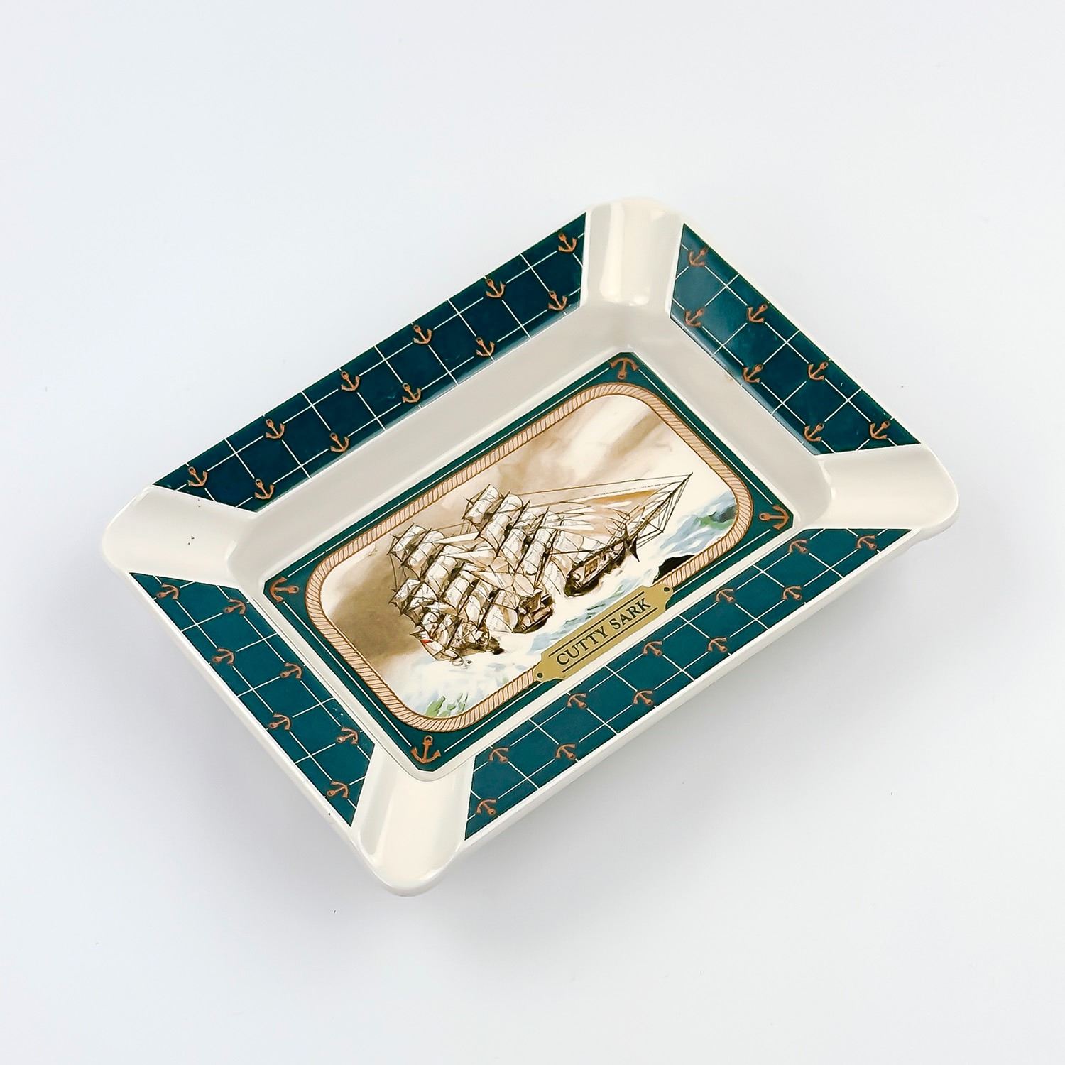 #8128 - PORCELAIN ASHTRAY DEPICTING THE CUTTY SARK SHIP. 1987 ANATOLE GMBA - LICENSEE ENESCO IMPORTS CORPORATION. GOLD AND BLACK STICKER READS: NC CAMERON & SONS LTD. TORONTO - JAPAN. MEASURES: