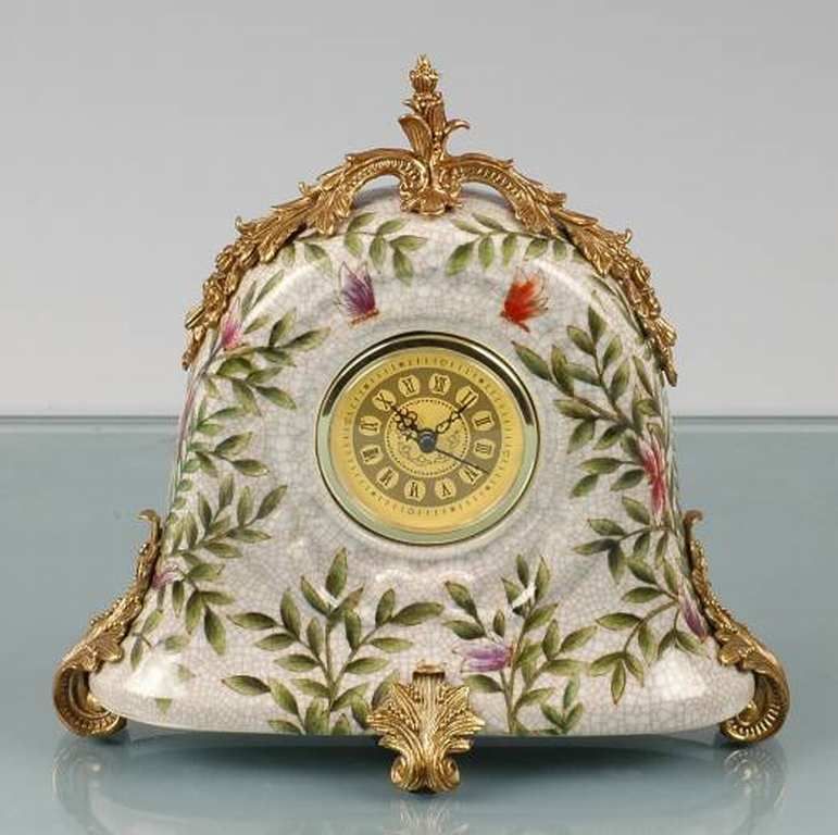 PORCELAIN AND BRASS CLOCK - CRACKLED PORCELAIN FINISH - HAND PAINTED LEAVES AND BUTTERFLIES - BRASS CROWN AND FEET - ROMAN NUMERALS - QUARTZ MOVEMENT - 10.5L" x 5.5W" x 10H"