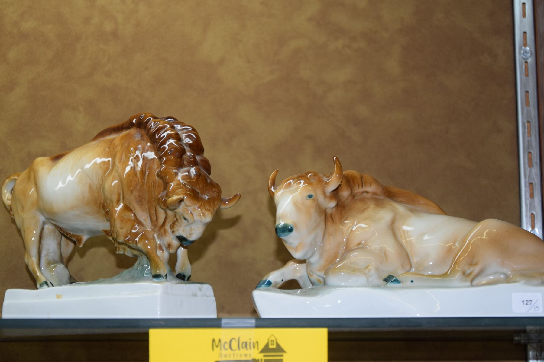 PORCELAIN BUFFALO LYING DOWN & PORCELAIN STANDING BISON, ZSOLNAY, HUNGARY (2 CS)