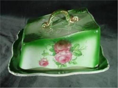 PORCELAIN CHEESE KEEPER HAND PAINTED IN A PINK ROSE MOTIF ON GREEN, TWO PIECES. 4.5"X7"X8".