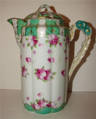 PORCELAIN CHOCOLATE POT. Green, gilt, & hand painted floral decoration. No mark. 9” H