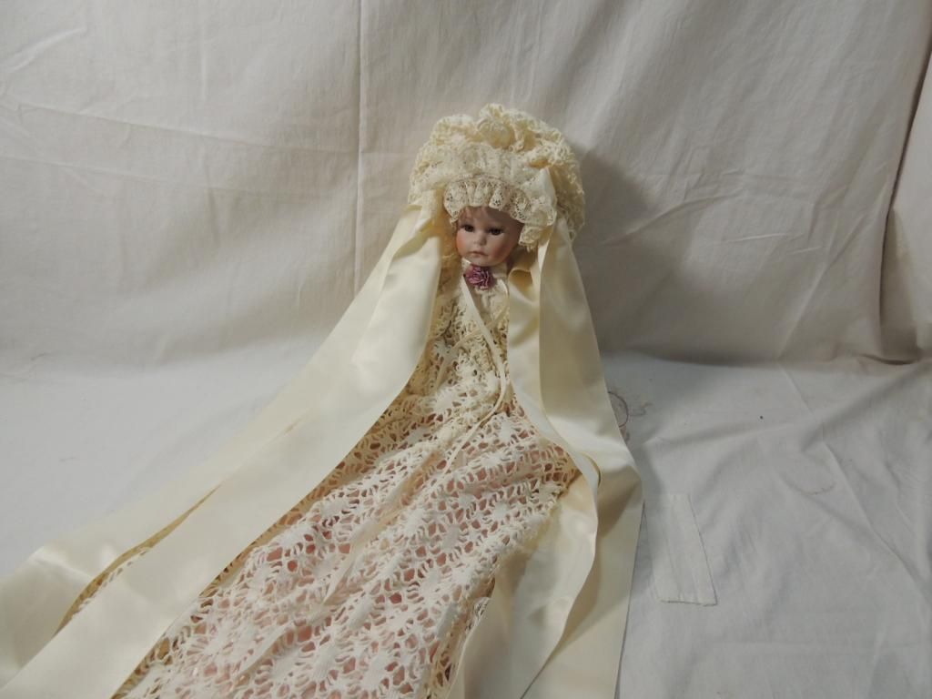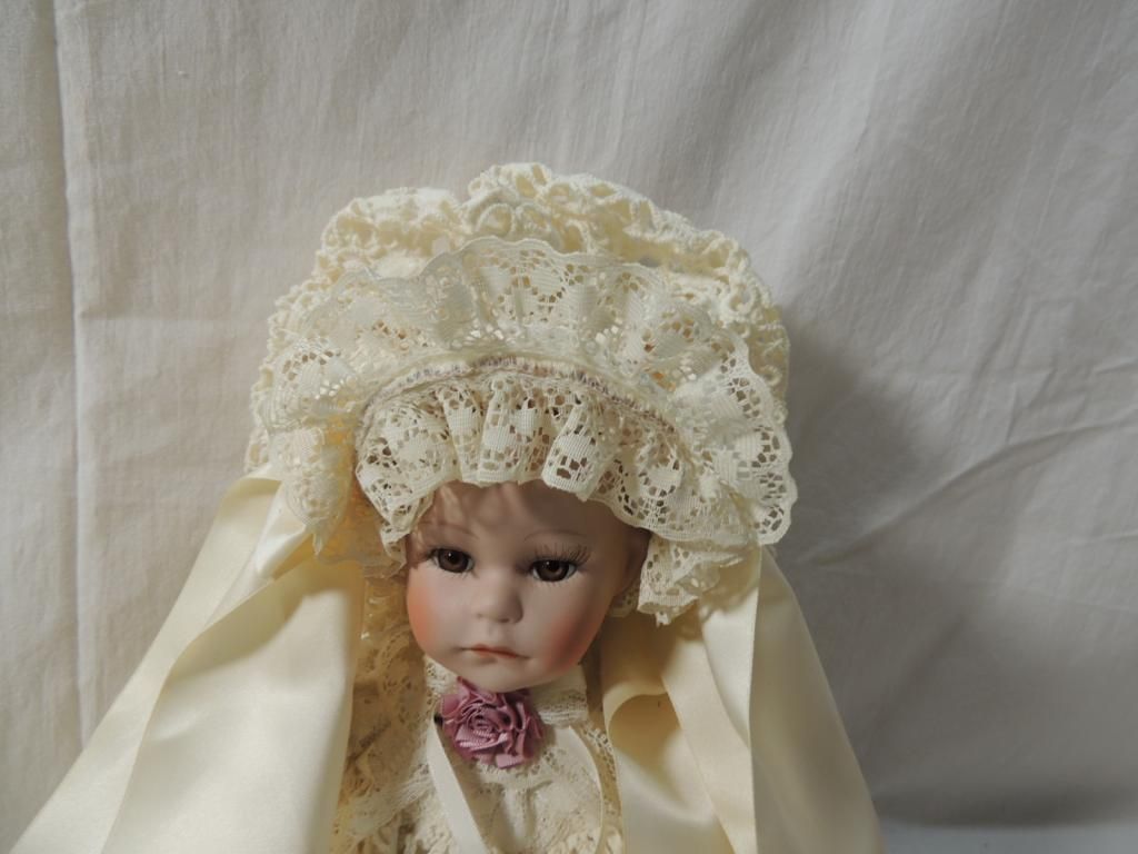 LONG CHRISTENING DRESS LARGE LONG SATIN RIBBONS. ROSE RIBBON FLOWERS. BONNET. COLLECTIBLE DOLL. IN BOX. COLLECTORS. GOOD CONDITION. AS SHOWN. SEE PHOTO FOR MORE DETAILS.